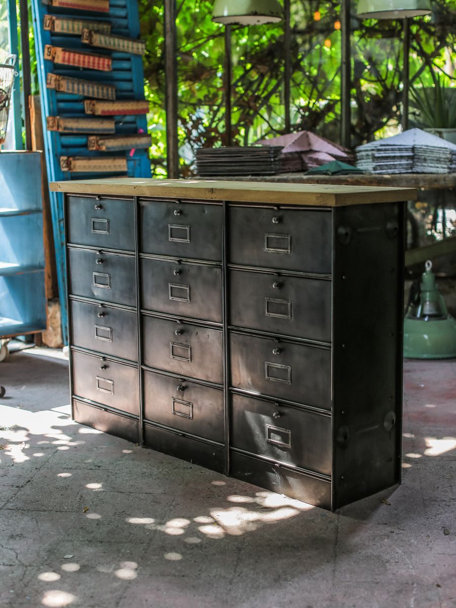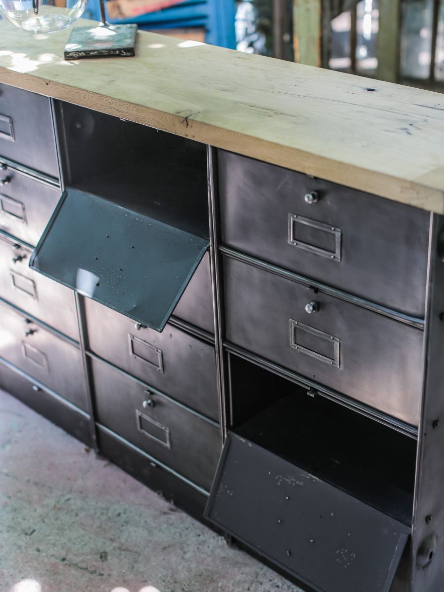 ancien meuble console 12 casiers industriel a clapet Roneo 1950 plateau chene massif