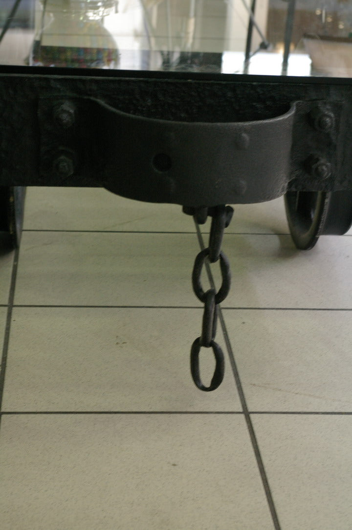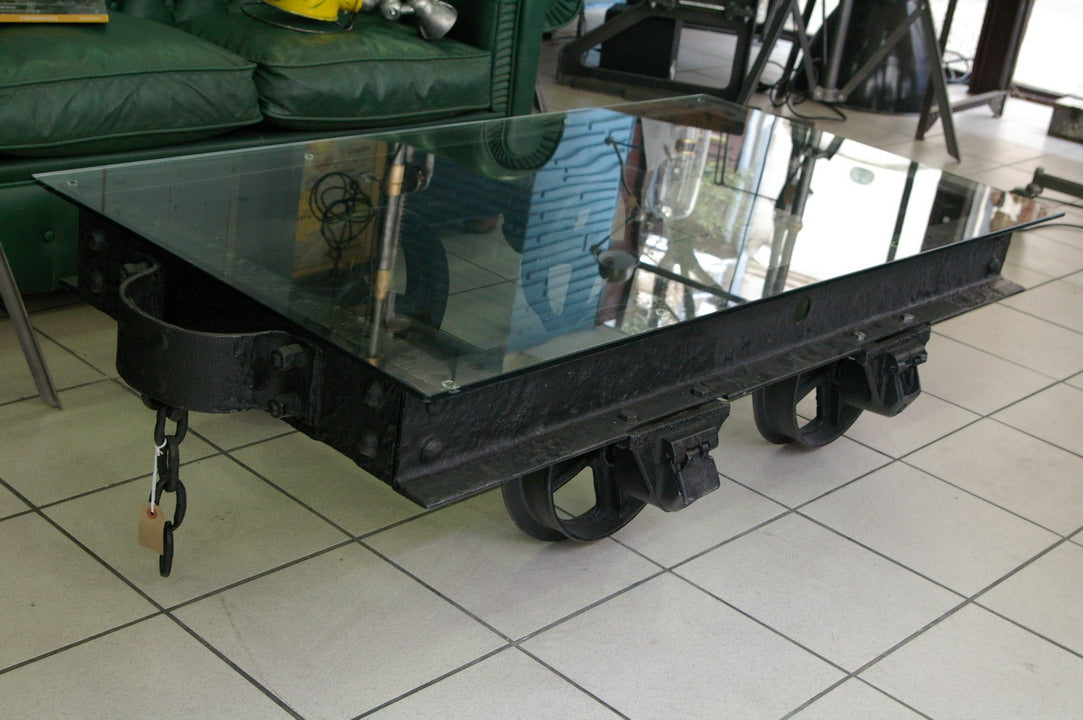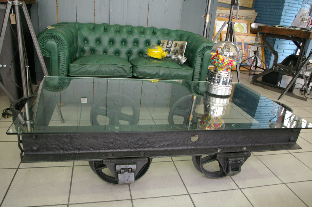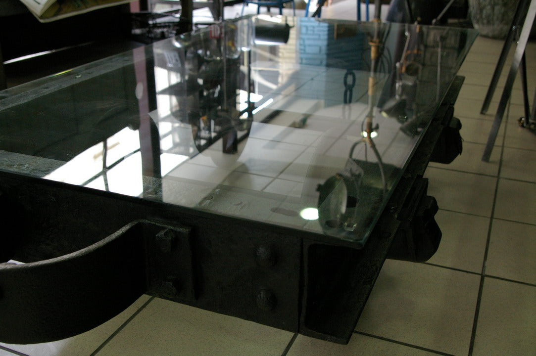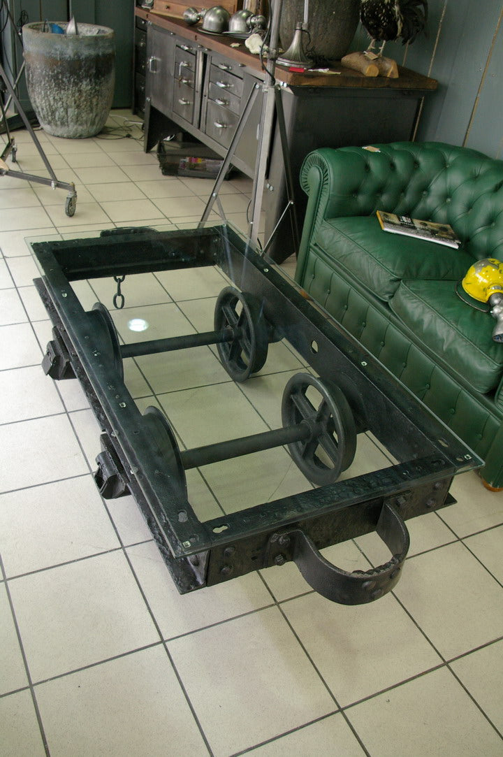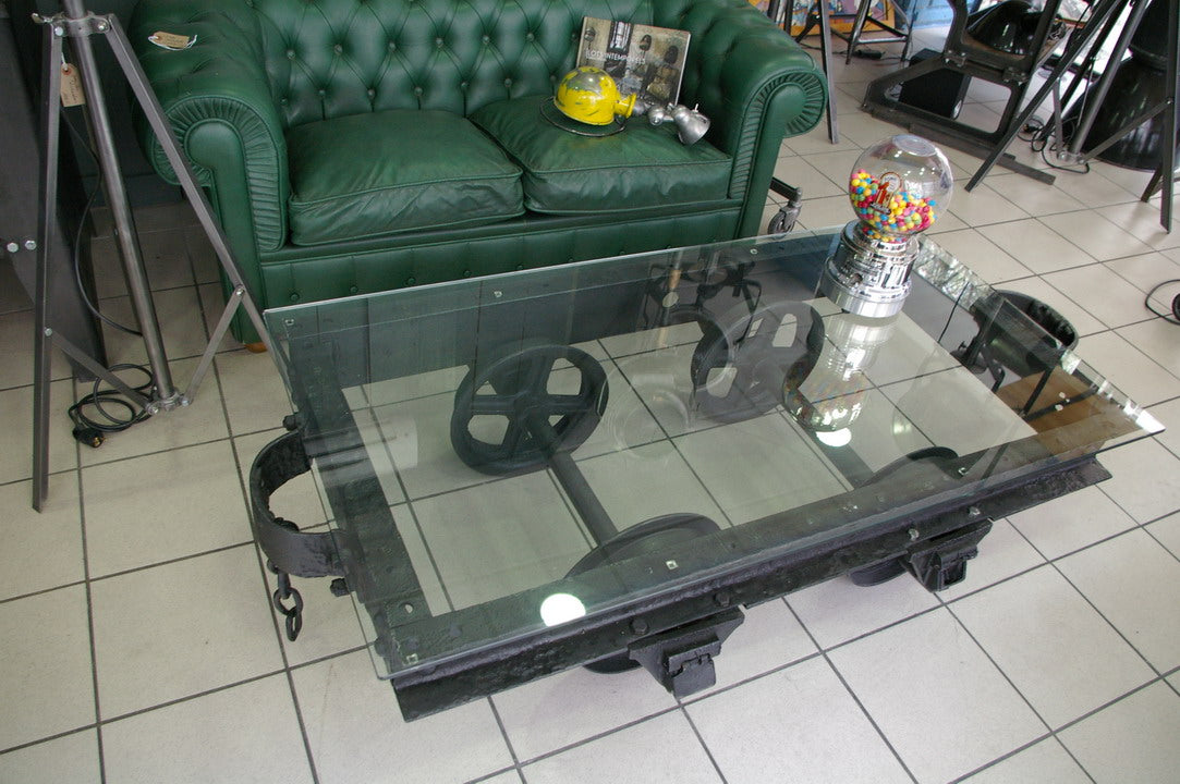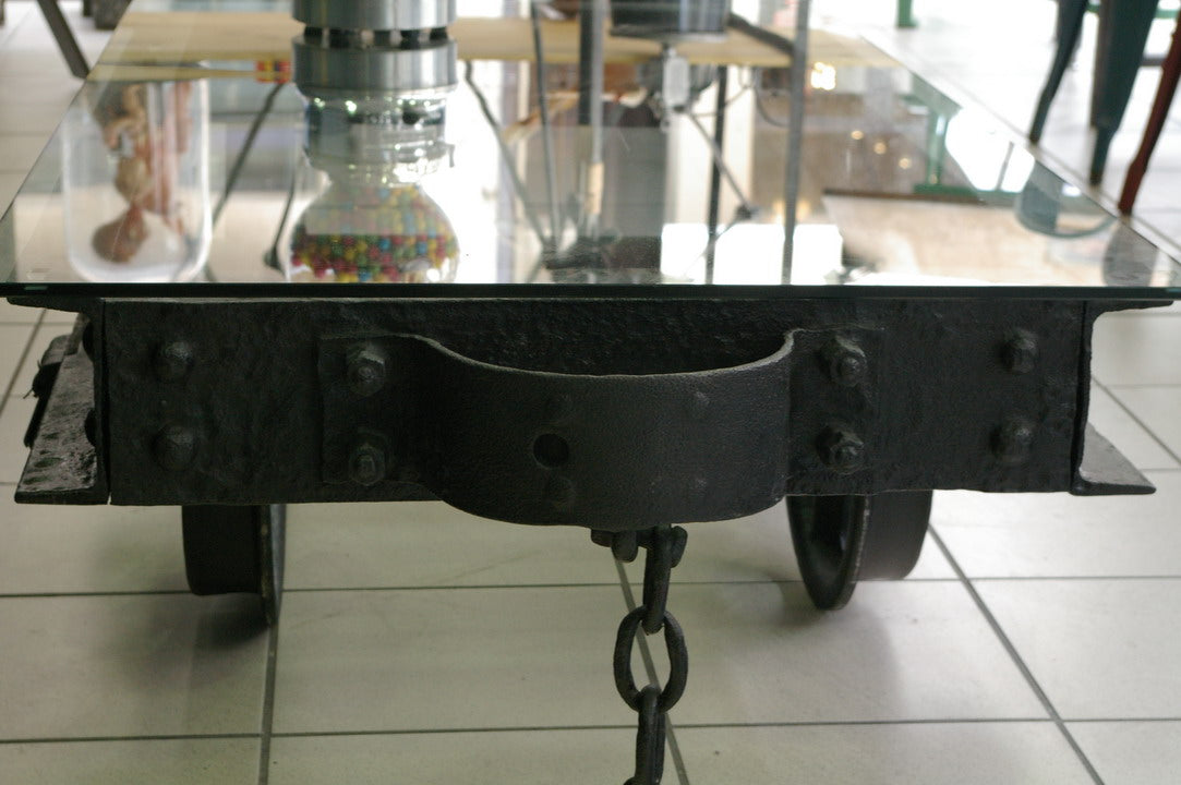 grande Table basse metal industrielle wagon de mine plateau verre