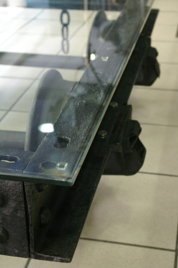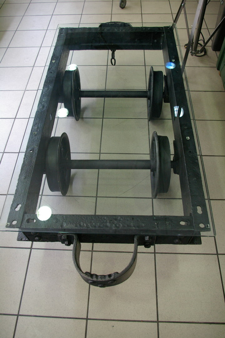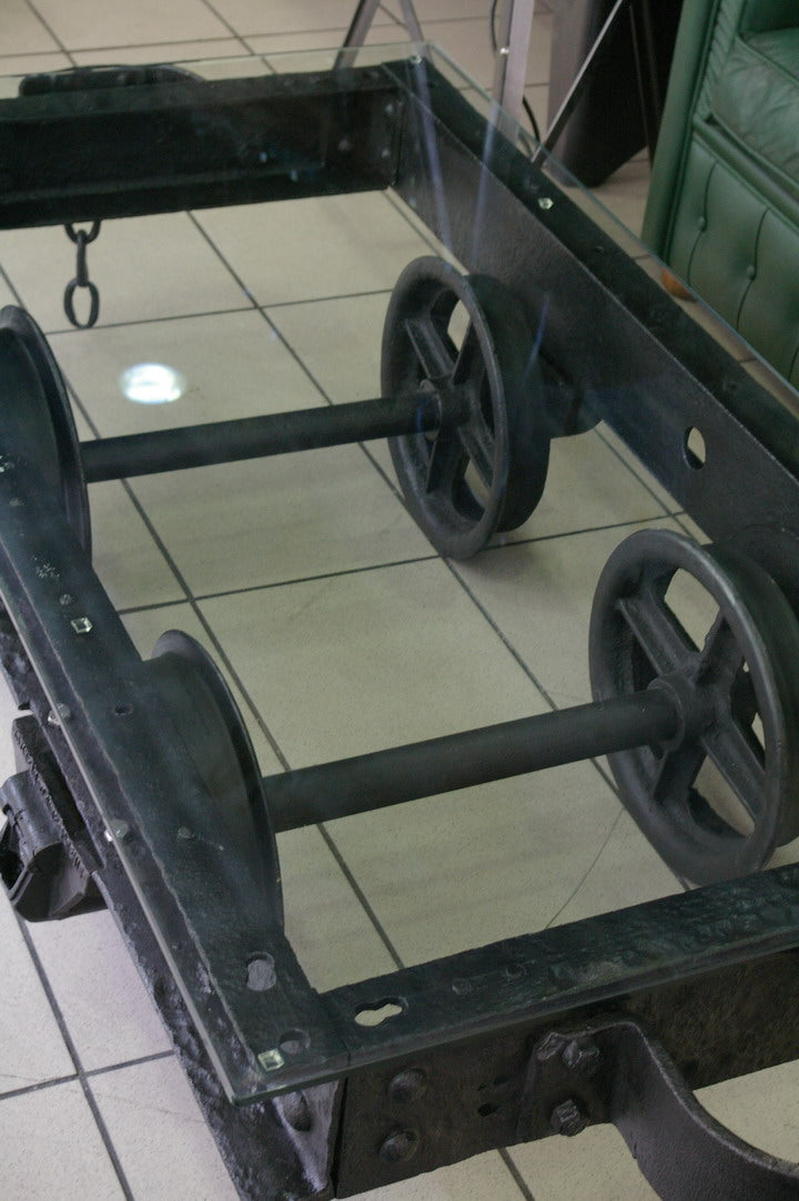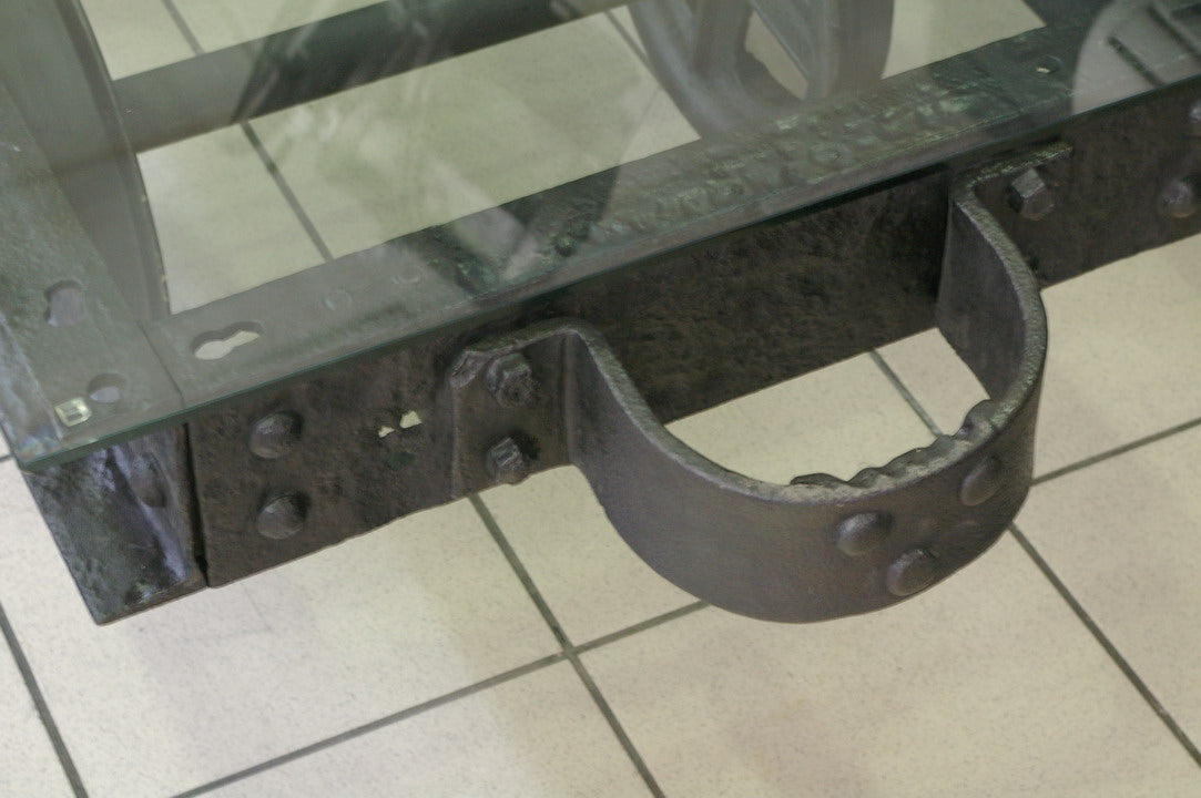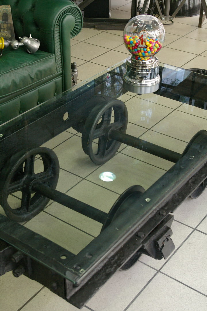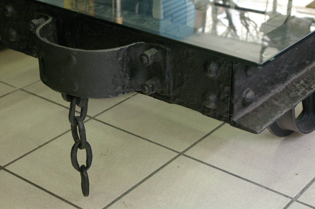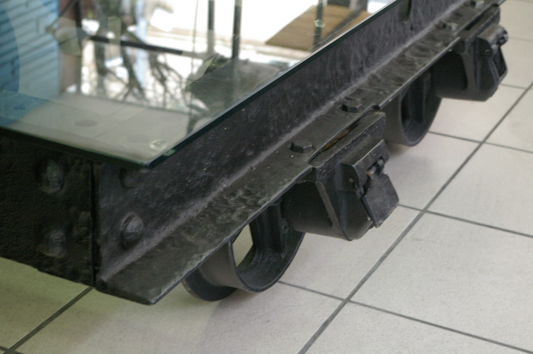 grande Table basse metal industrielle wagon de mine plateau verre