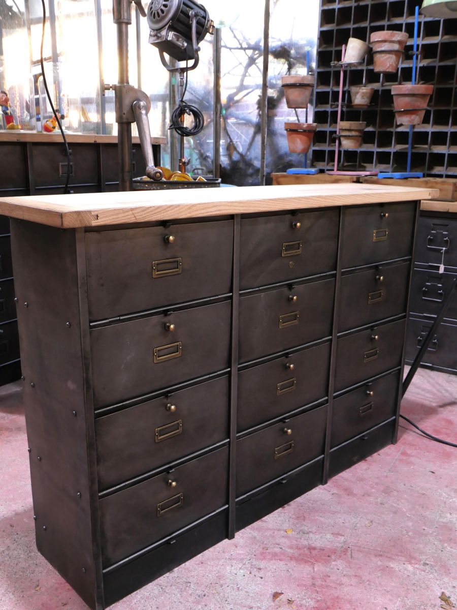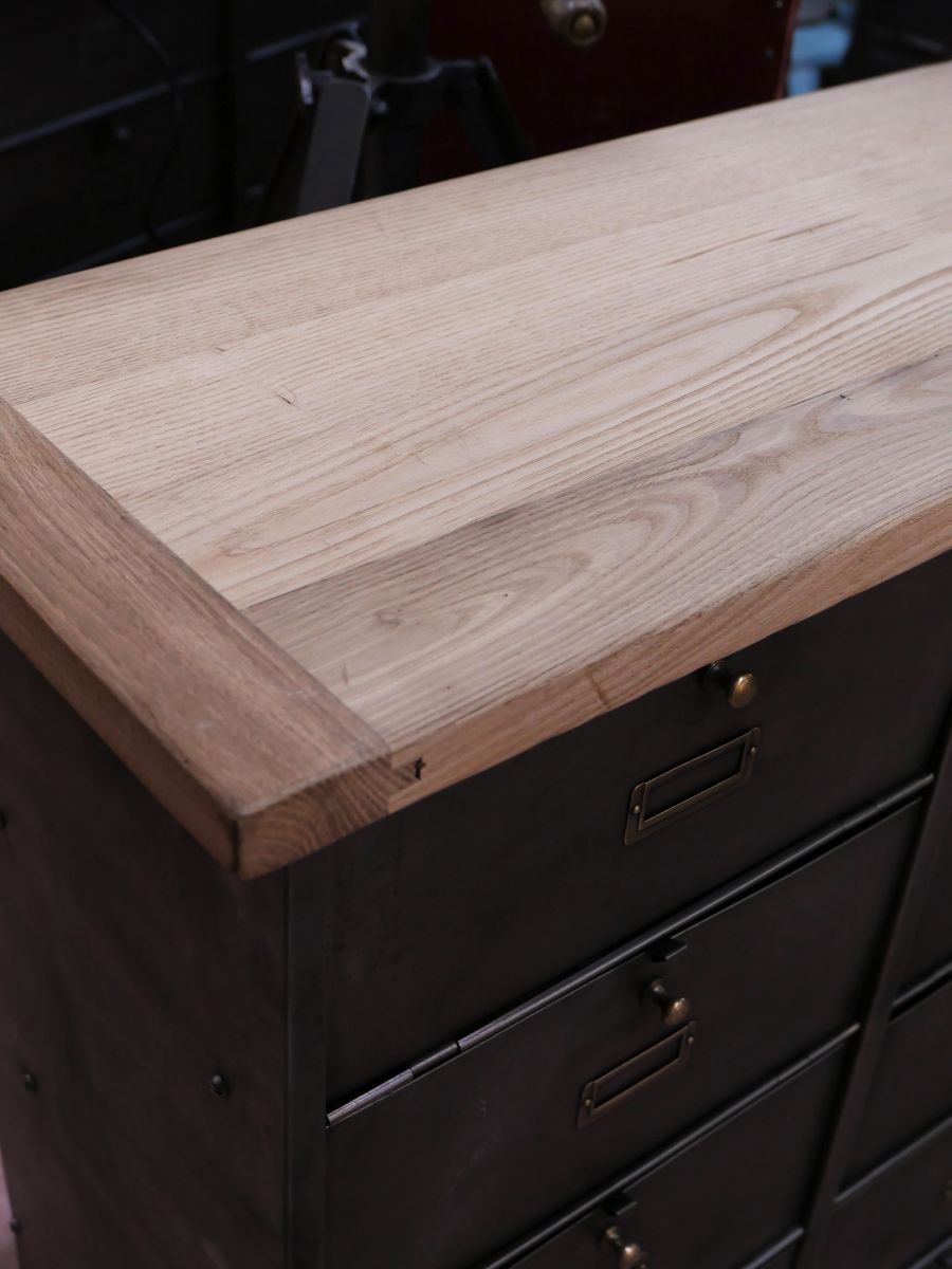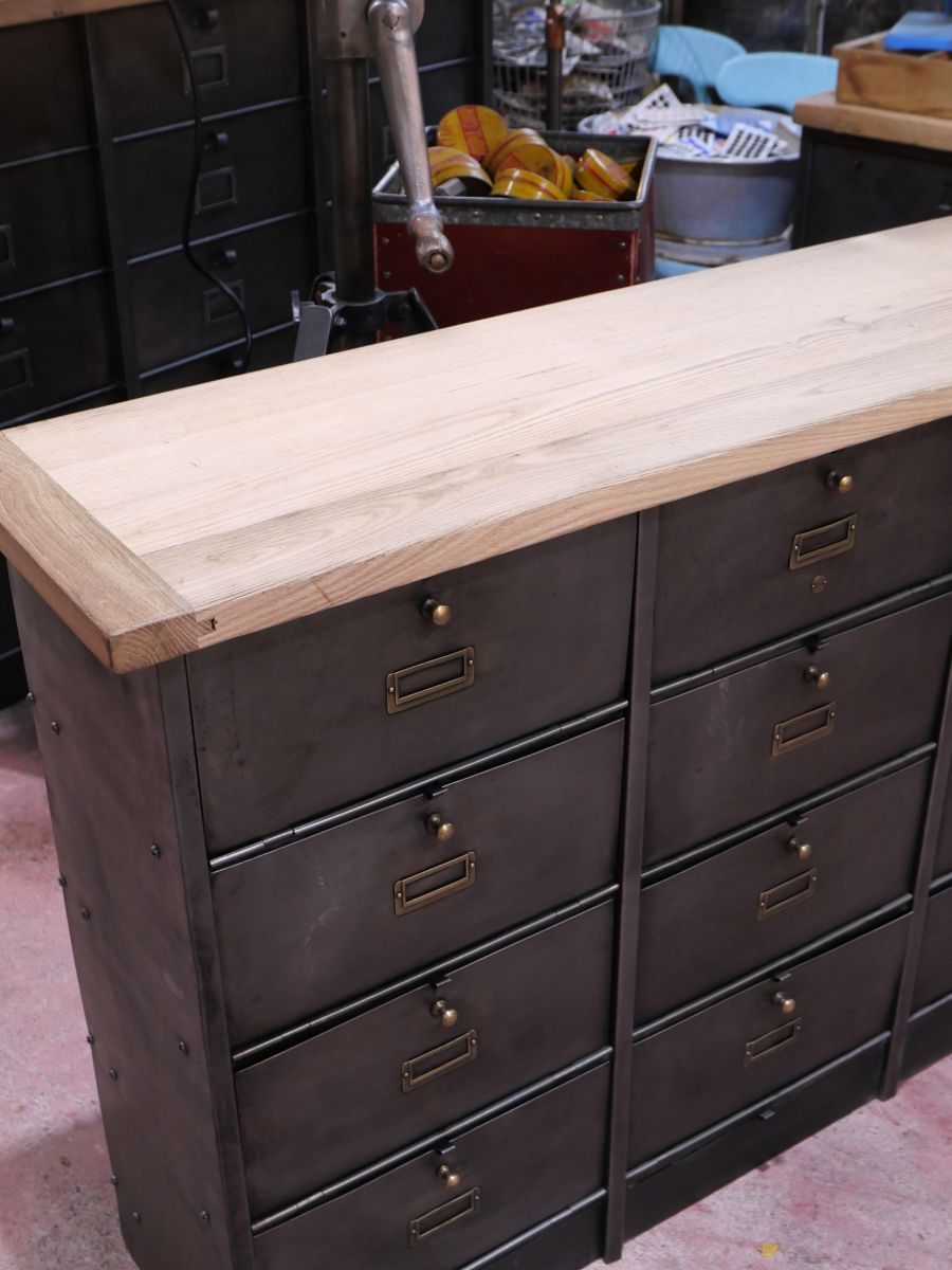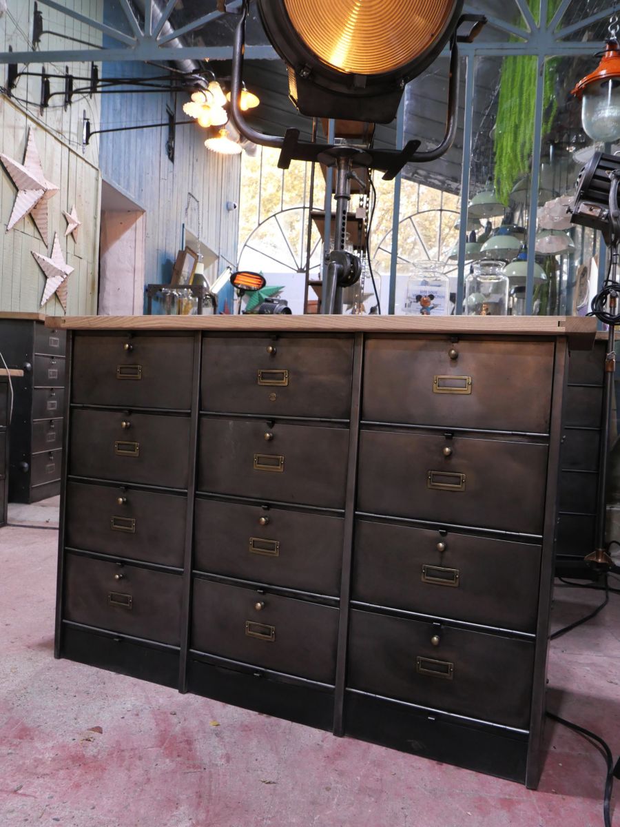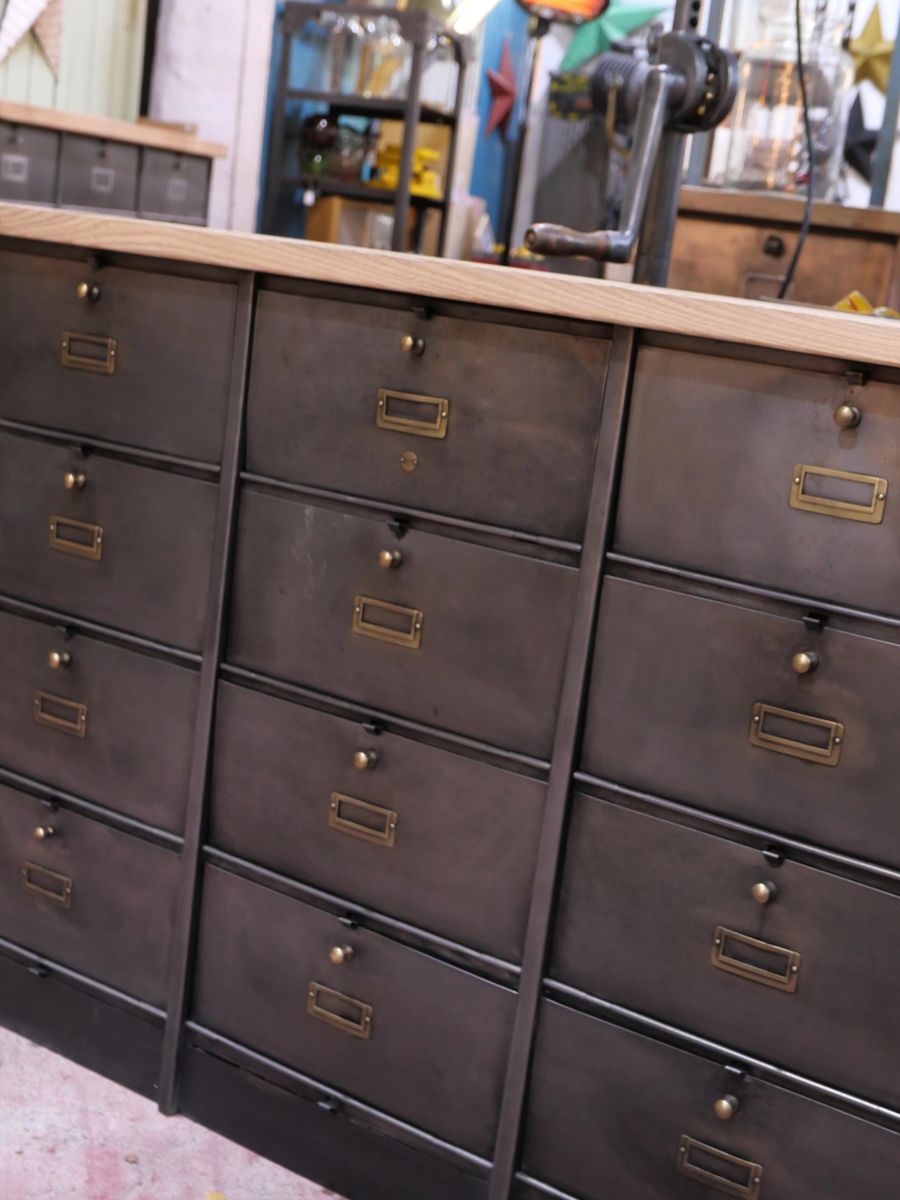 meuble console 12 casiers industriel clapet Roneo plateau chene massif