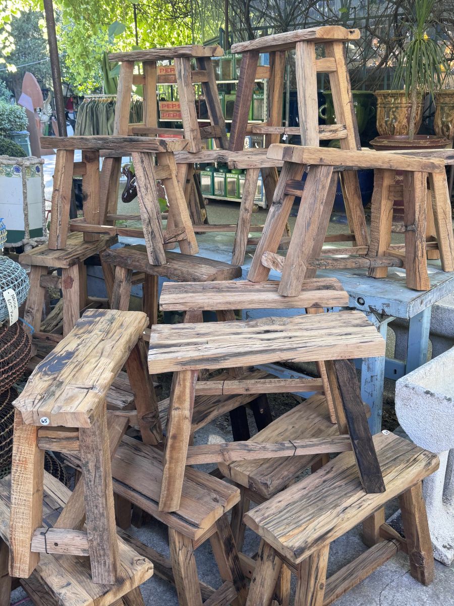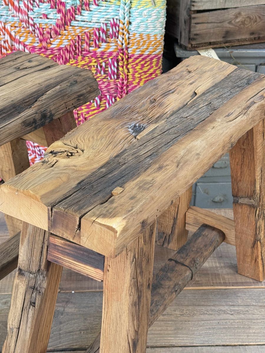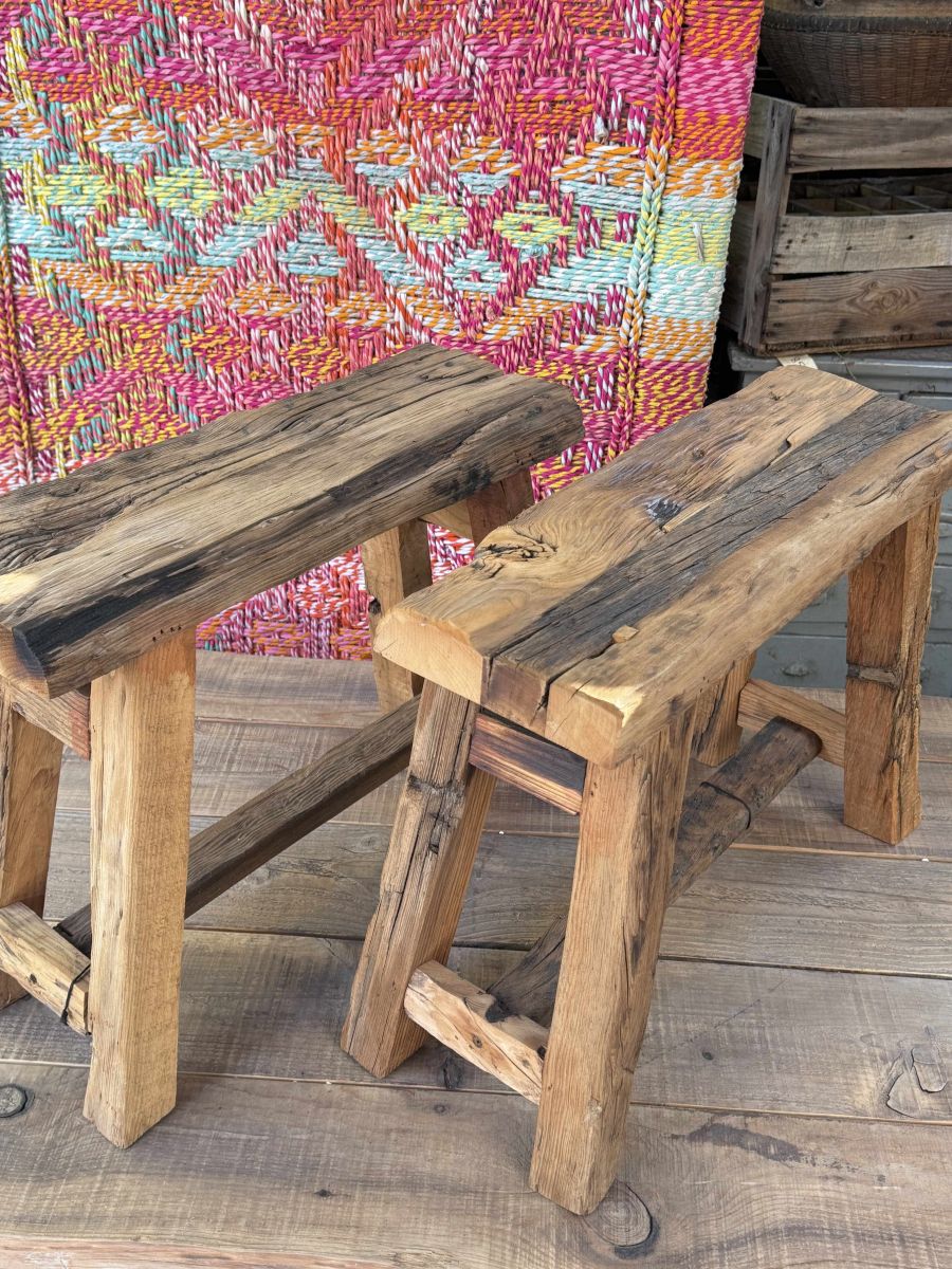 Tabourets fabriqués à la main à partir de bois recyclé.