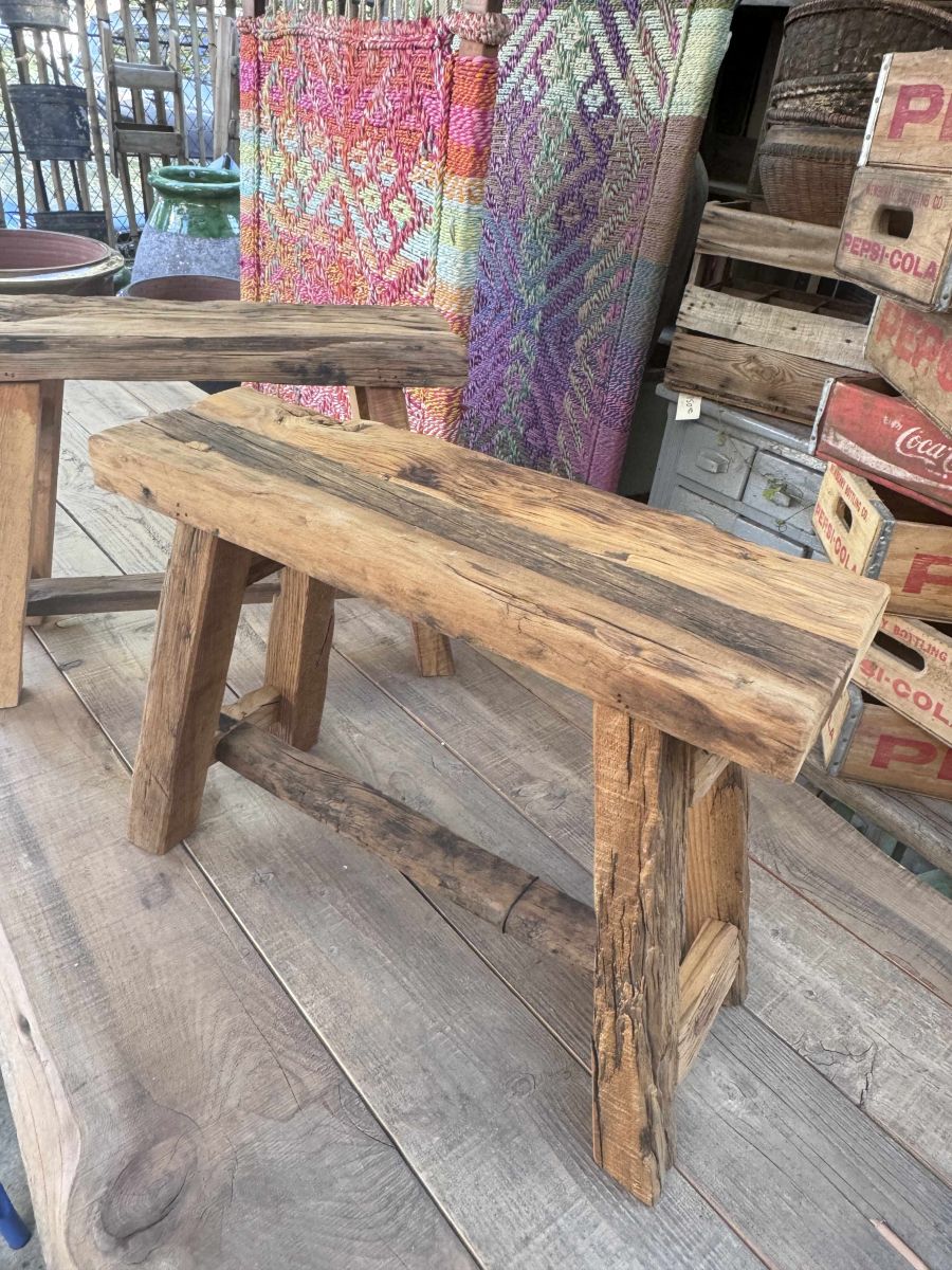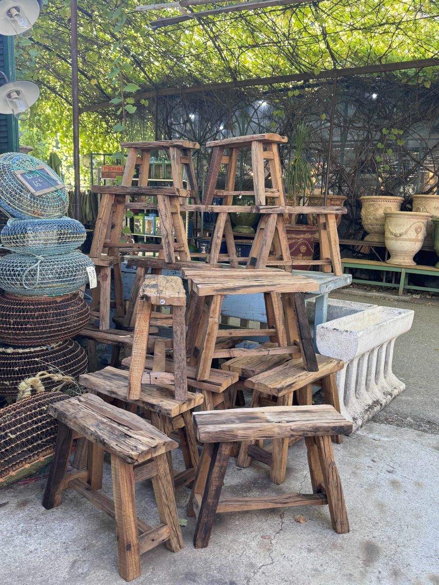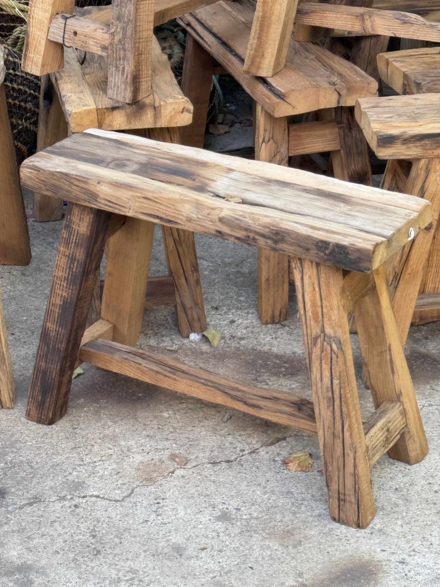 Tabourets fabriqués à la main à partir de bois recyclé.