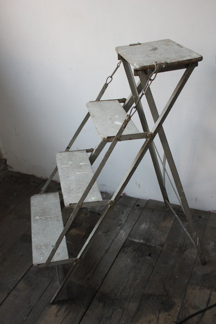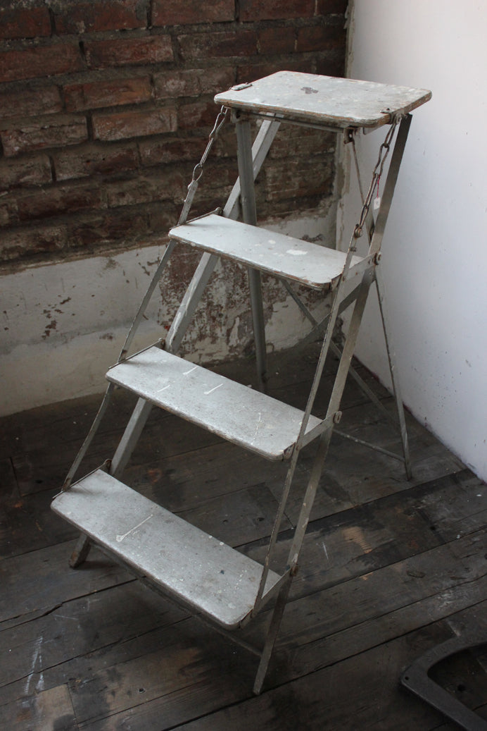 Escabeau pliant d'atelier en bois et metal, superbe patine.