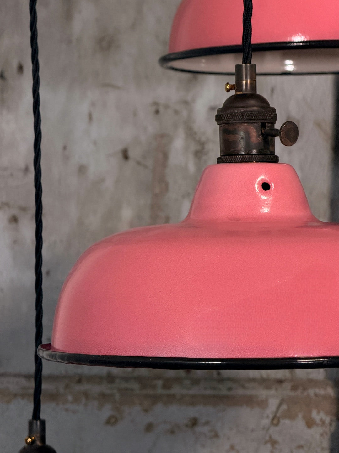 Suspension en tôle émaillée rose, soulignée d'un délicat liseré noir, au design sobre et fonctionnel inspiré des luminaires d'atelier.