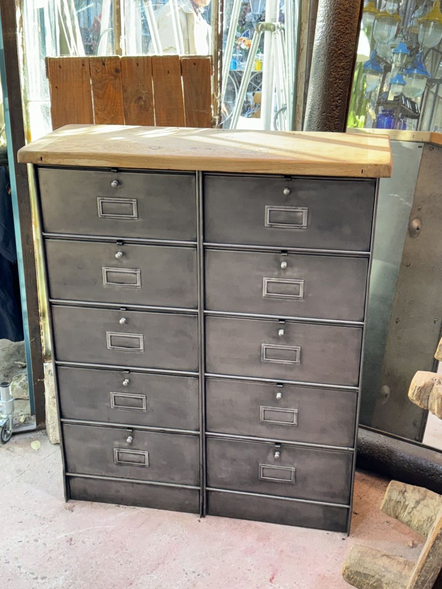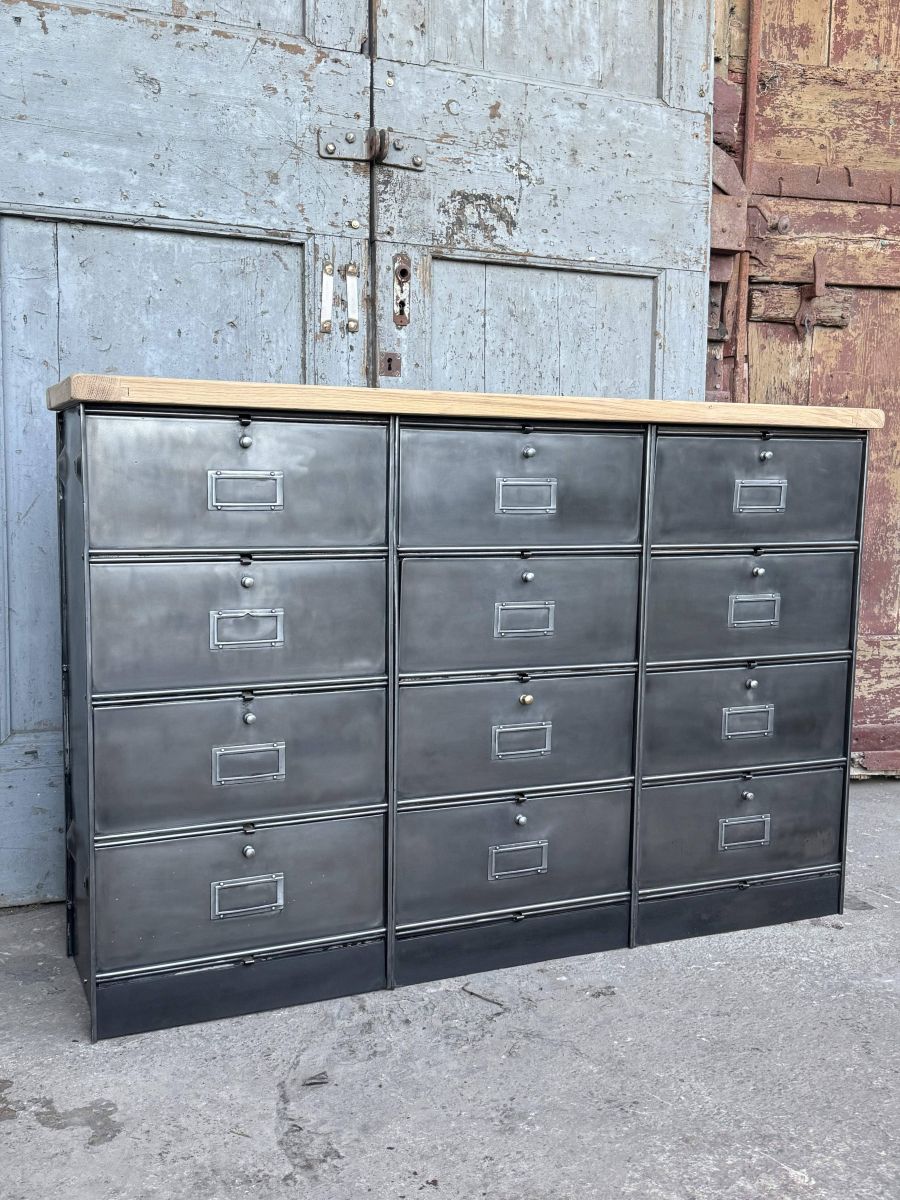 enfilade industrielle 12 compartiments atelier militaire plateau vieux chene massif