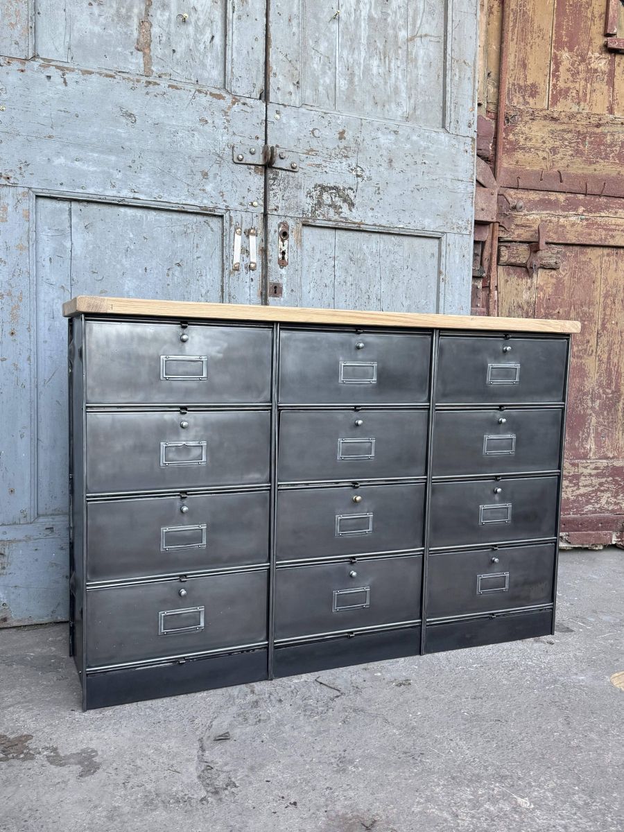 ancien meuble console 12 casiers industriel a clapet Roneo 1950 plateau chene massif