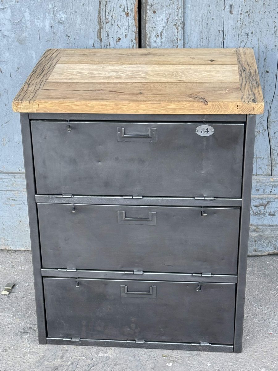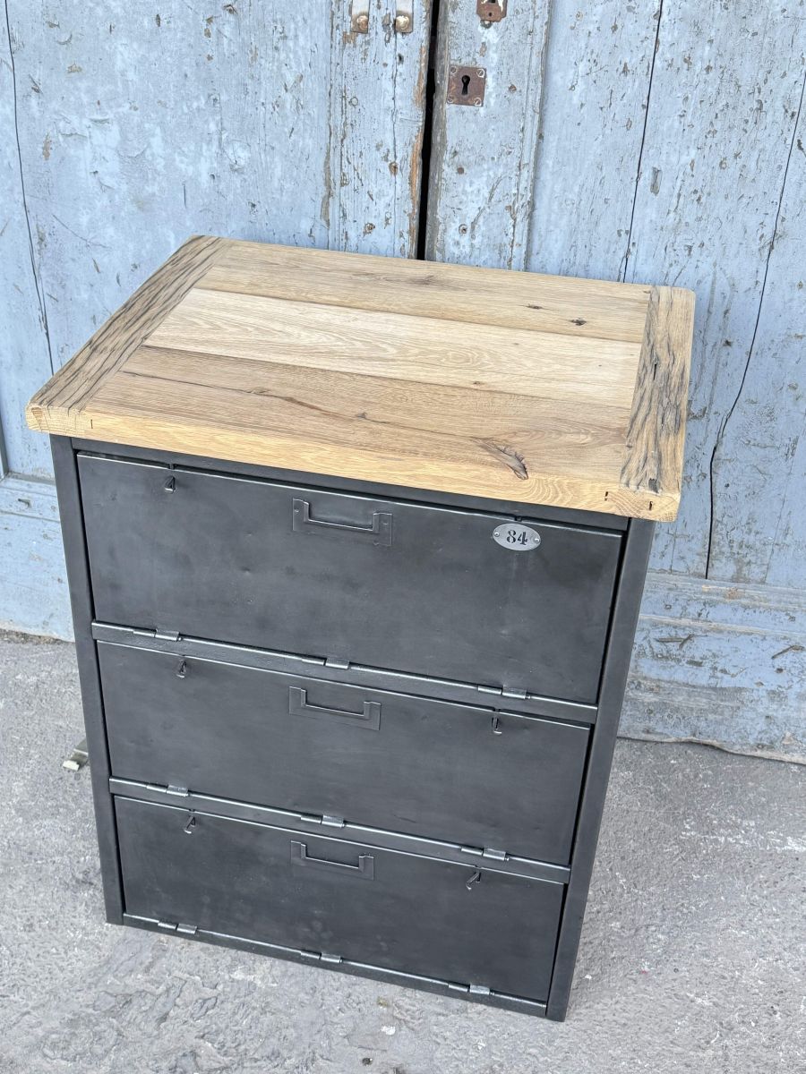 meuble industrielle 3 compartiments atelier militaire plateau vieux chene massif