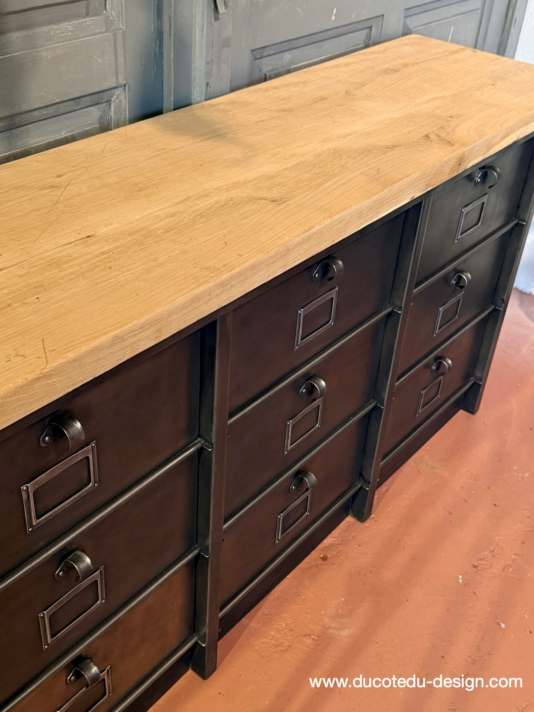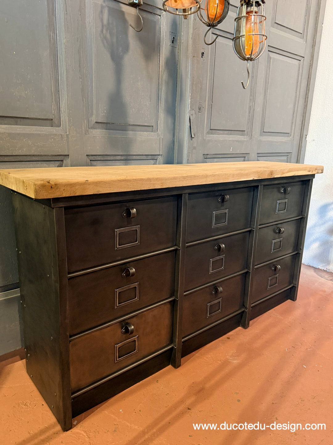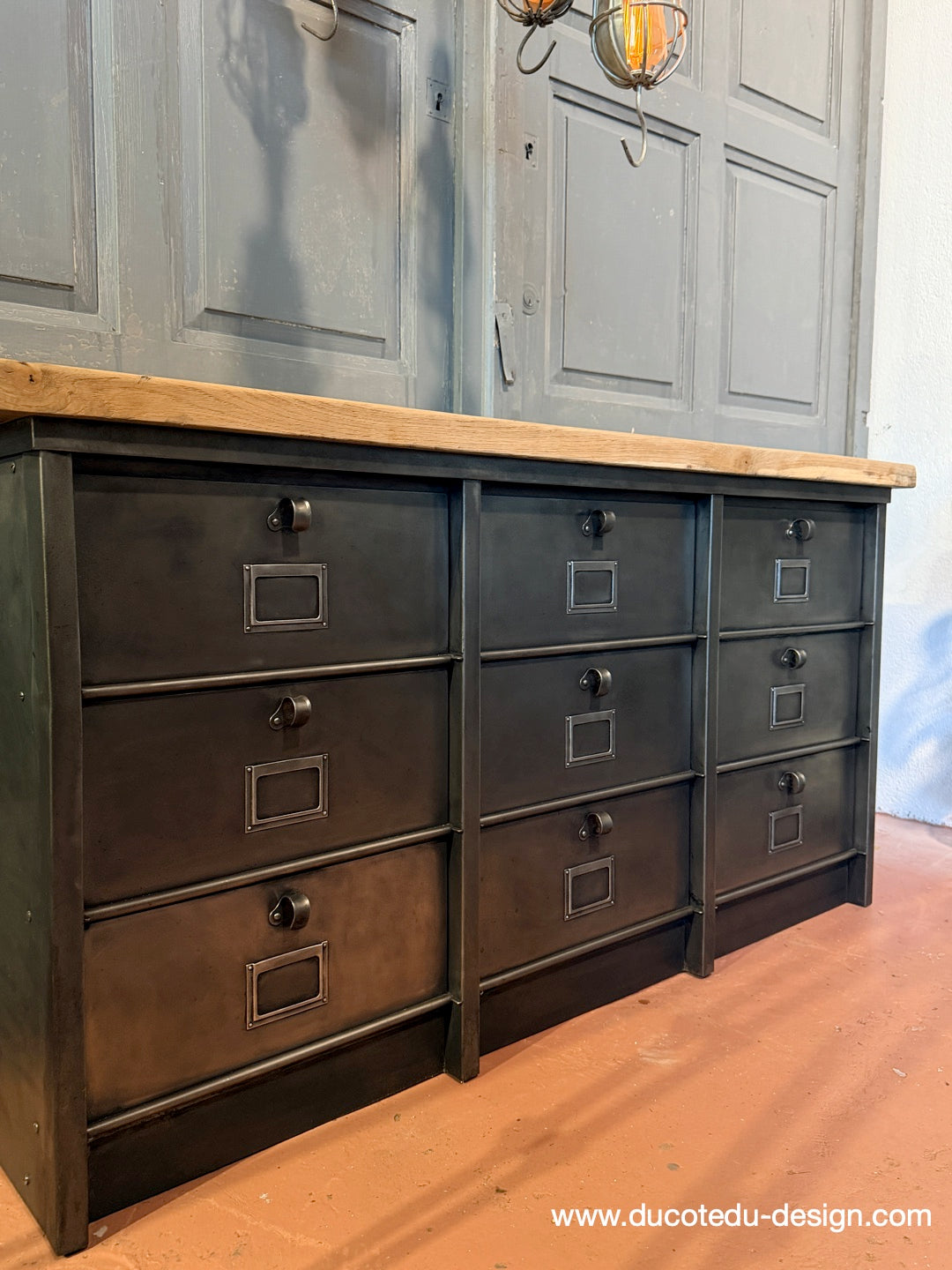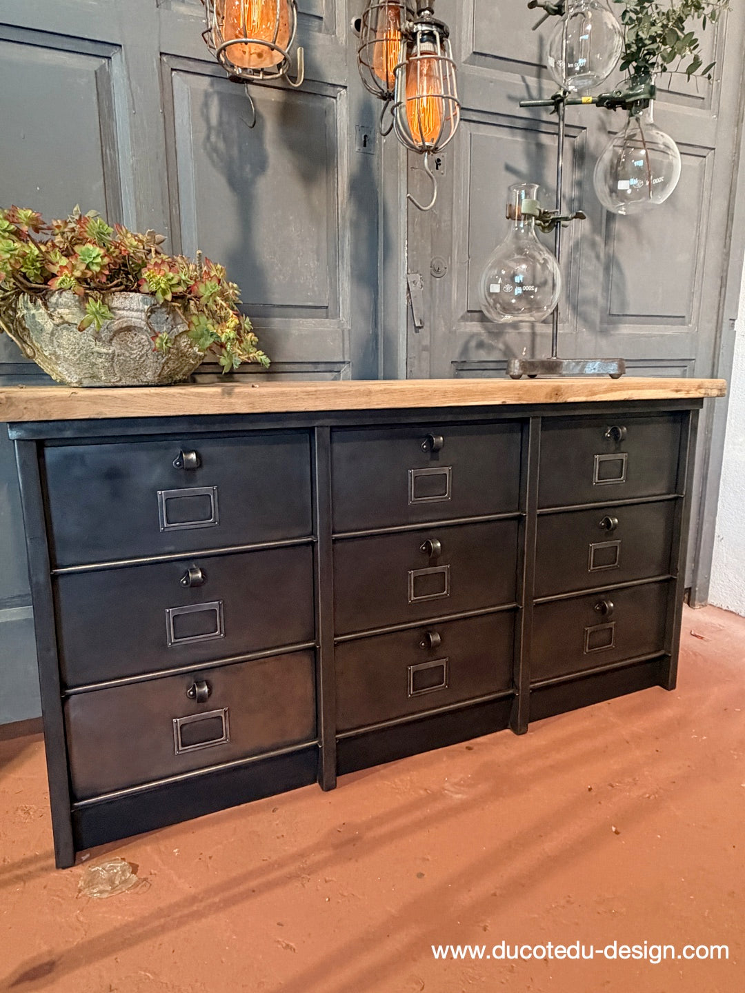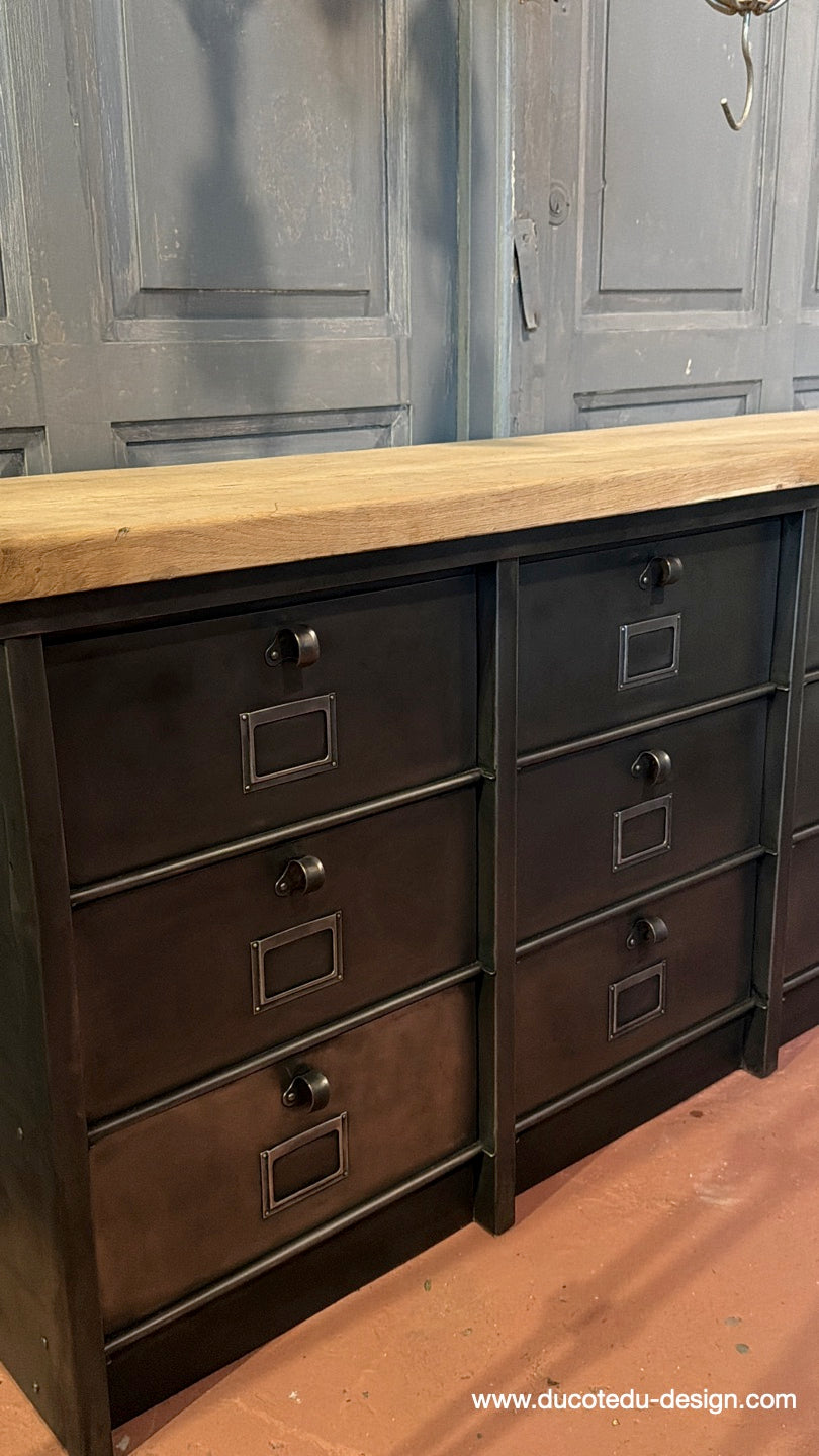 Parfait mélange entre mobilier factory vintage et fonctionnalité contemporaine. Idéal en buffet, meuble TV, rangement boutique ou console d'entrée.
