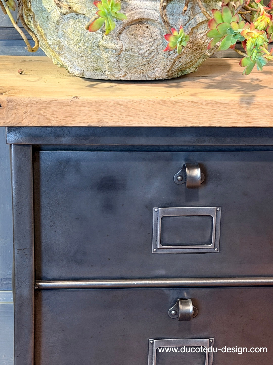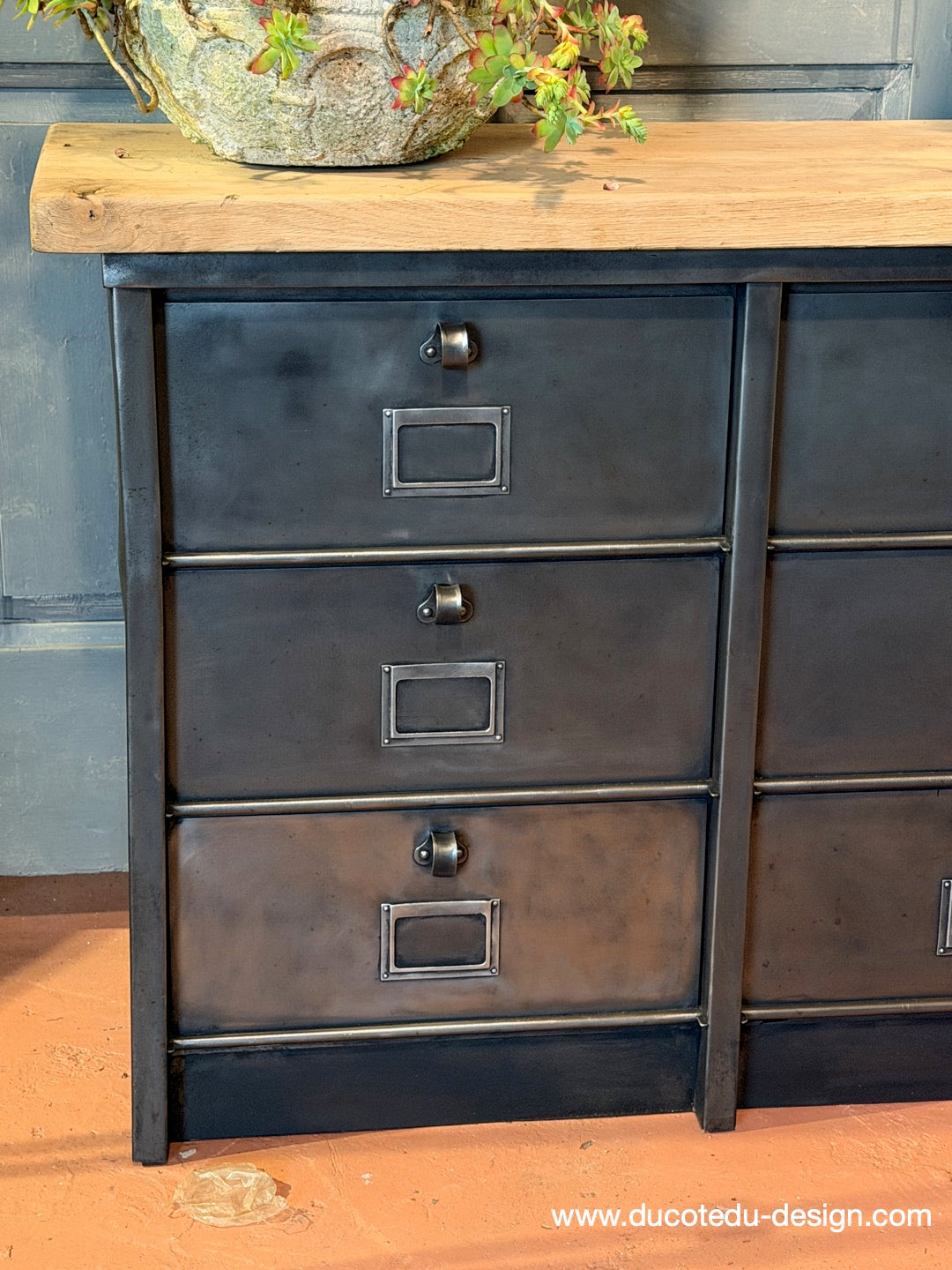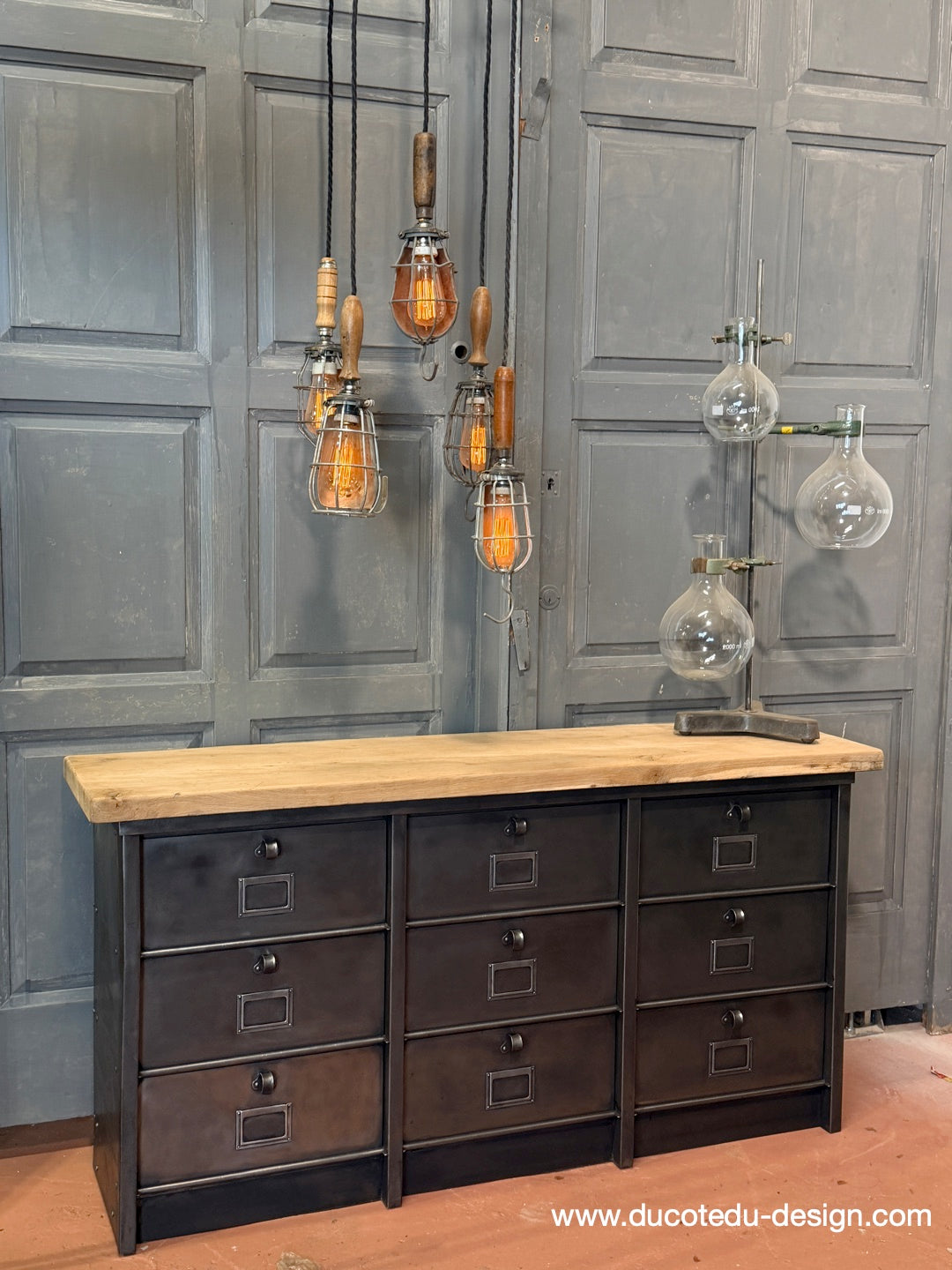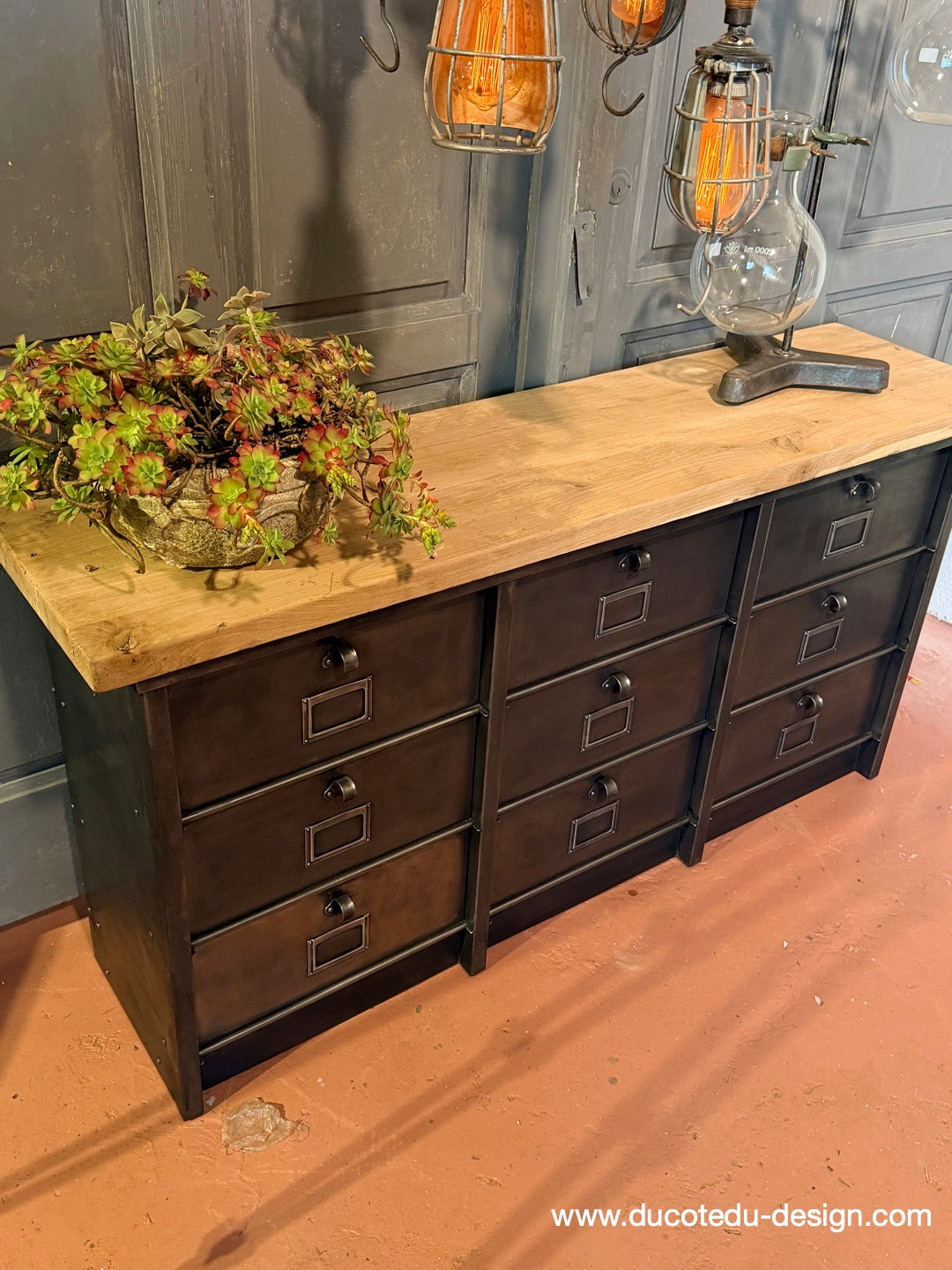 Parfait mélange entre mobilier factory vintage et fonctionnalité contemporaine. Idéal en buffet, meuble TV, rangement boutique ou console d'entrée.