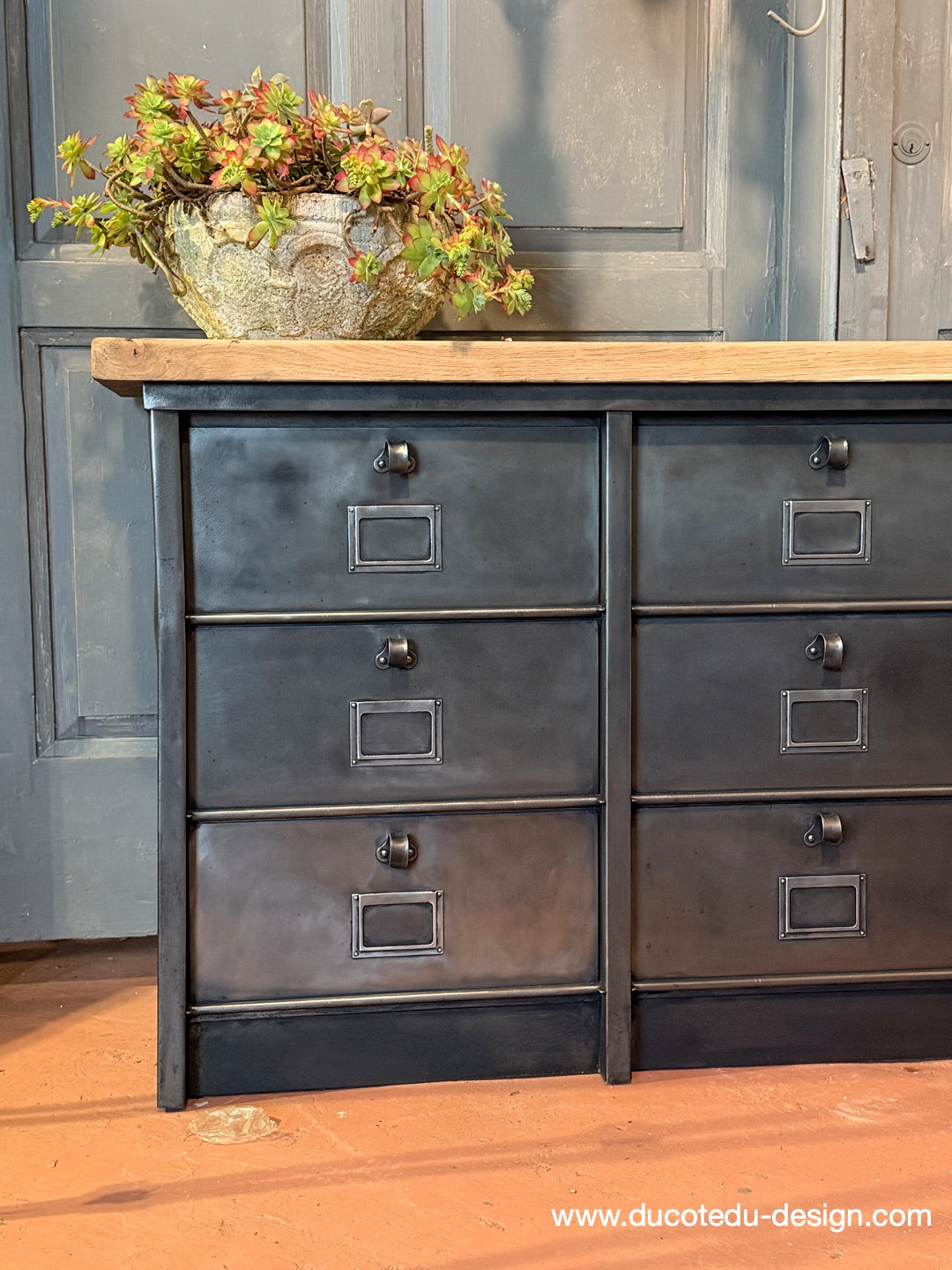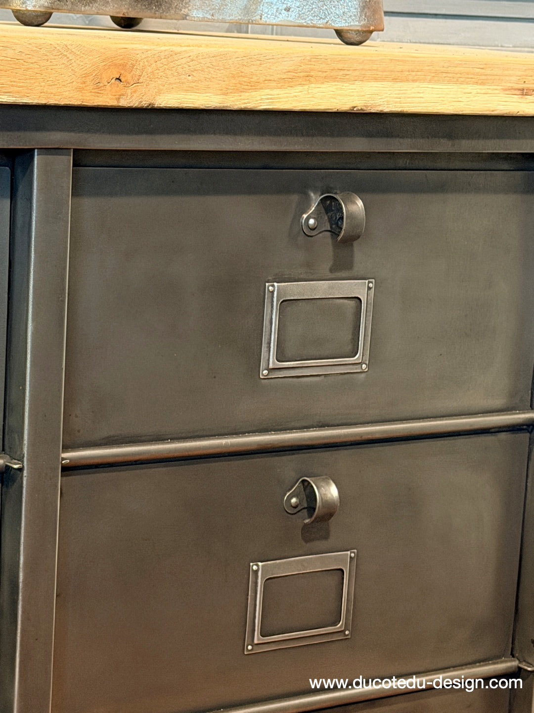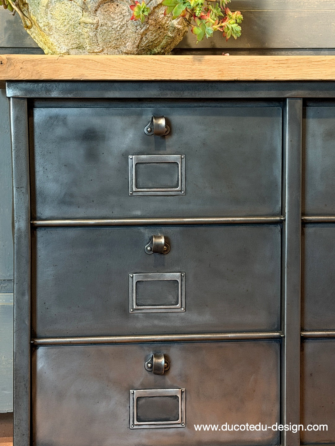 Meuble industriel à clapets en métal patine graphite, composé de multiples compartiments avec porte-étiquettes intégrés, surmonté d'un plateau en chêne massif.