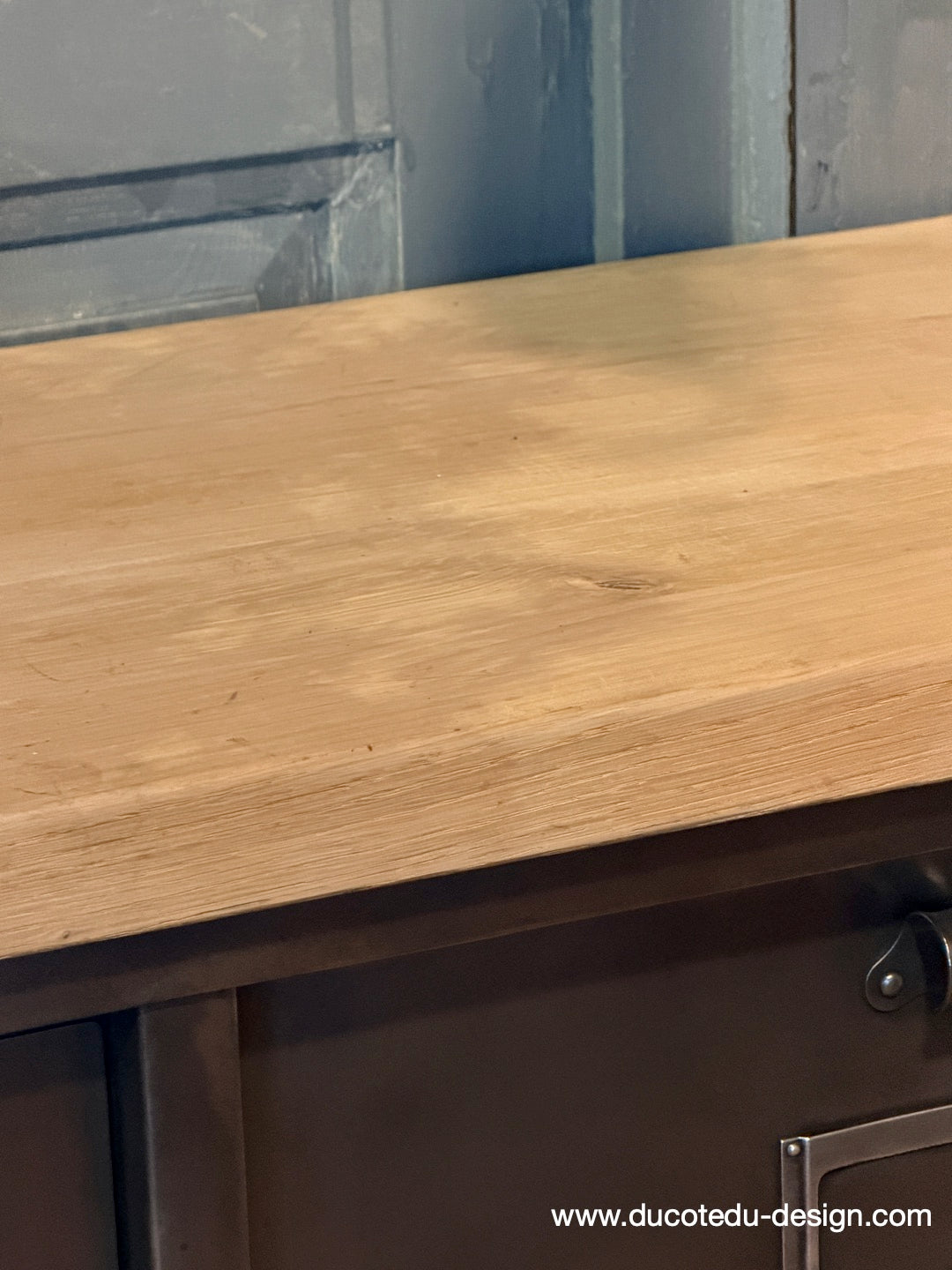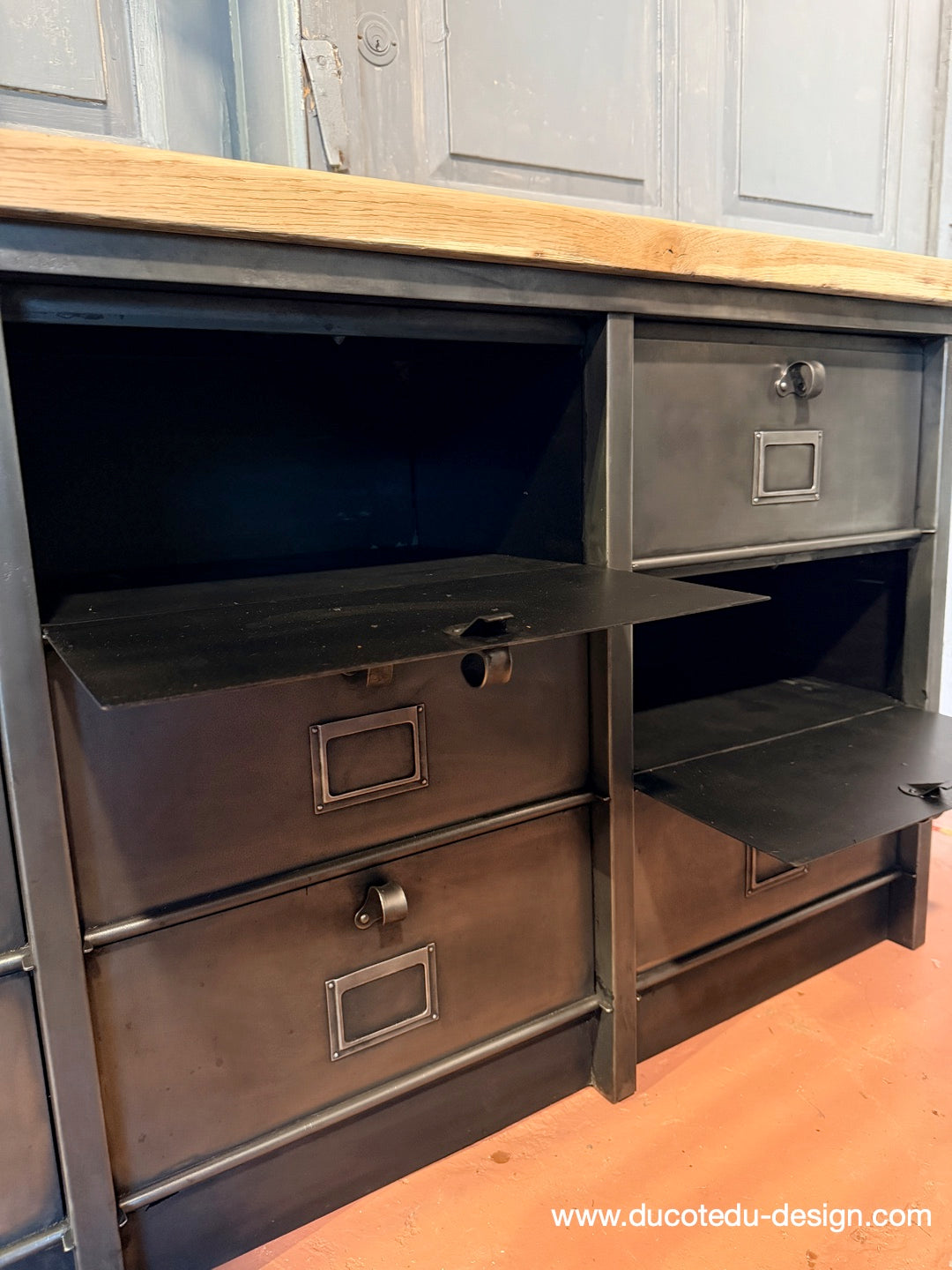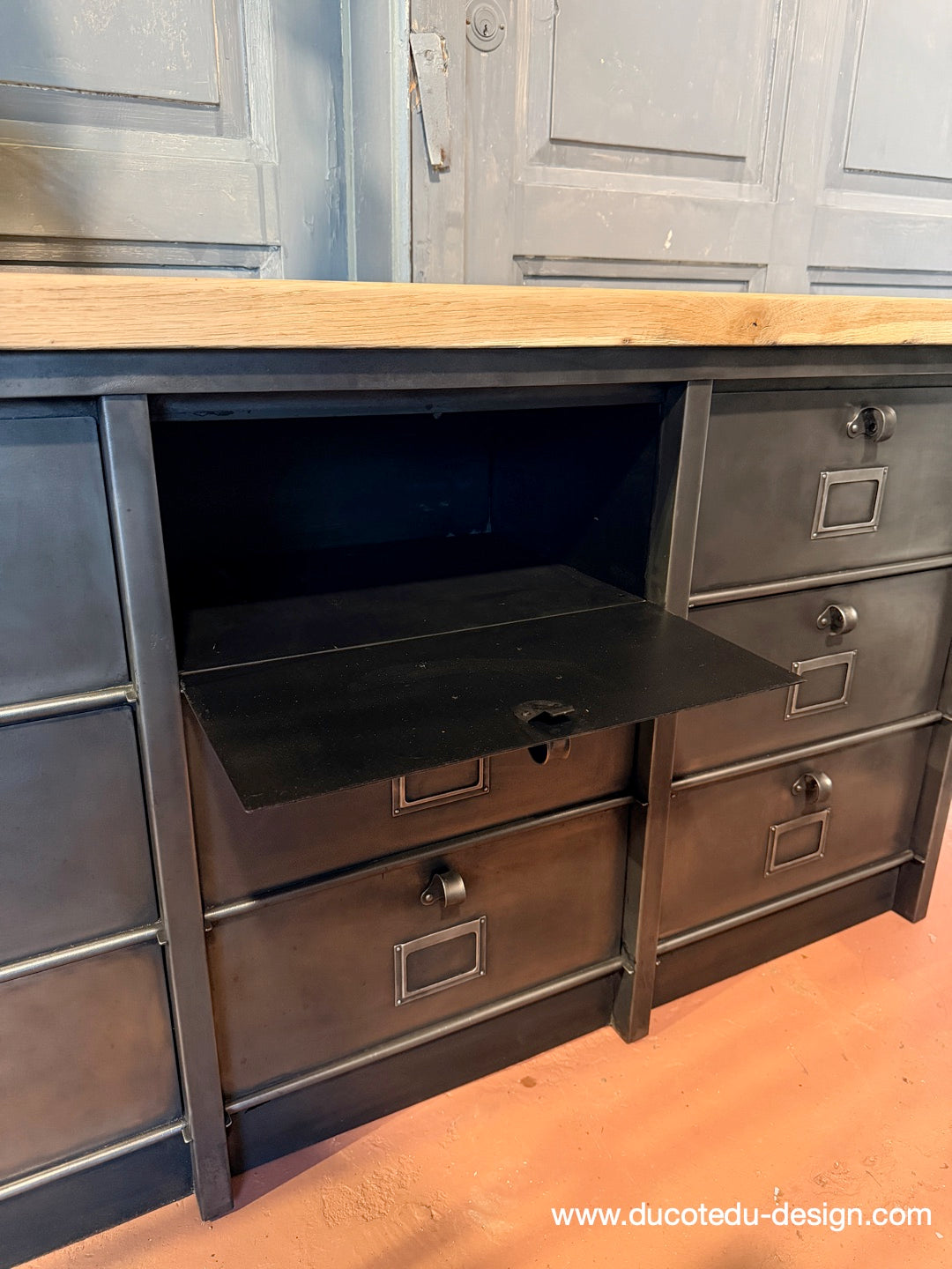 Meuble industriel à clapets - Buffet métal et plateau chêne massif