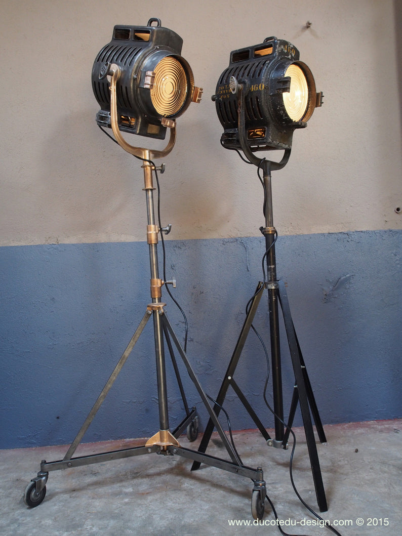 entirerement d'origine dans son jus muni d'une douille b22 standard équipé d'une lentille de fresnel possibilite de mettre une ampoule au choix fonctionne sur 220 V. très stable grace à son pied TRIPOD réglable jusqu'à une hauteur de plus de 2 metres