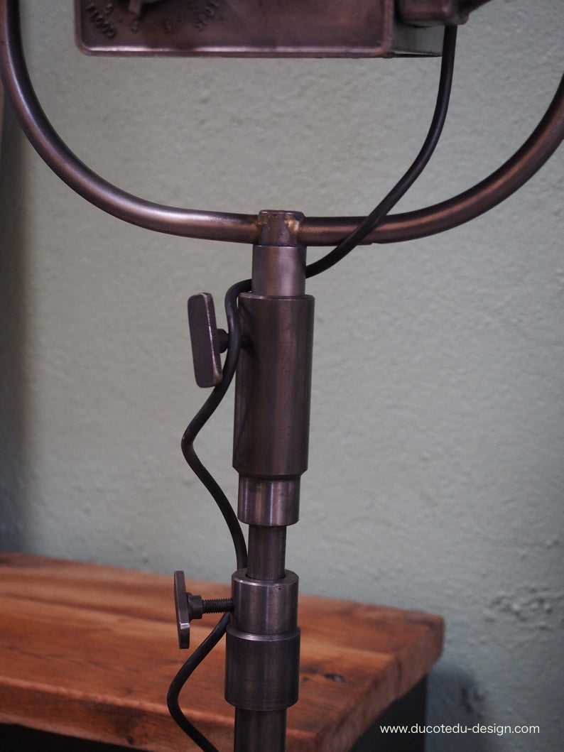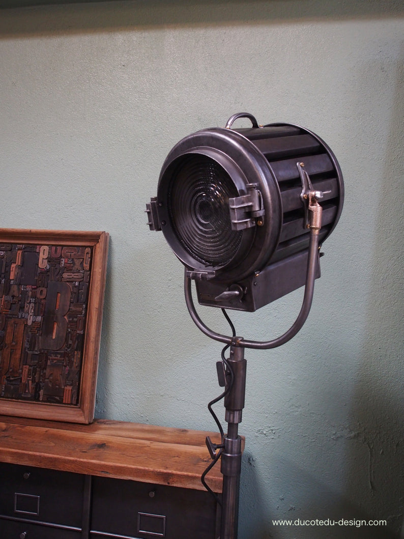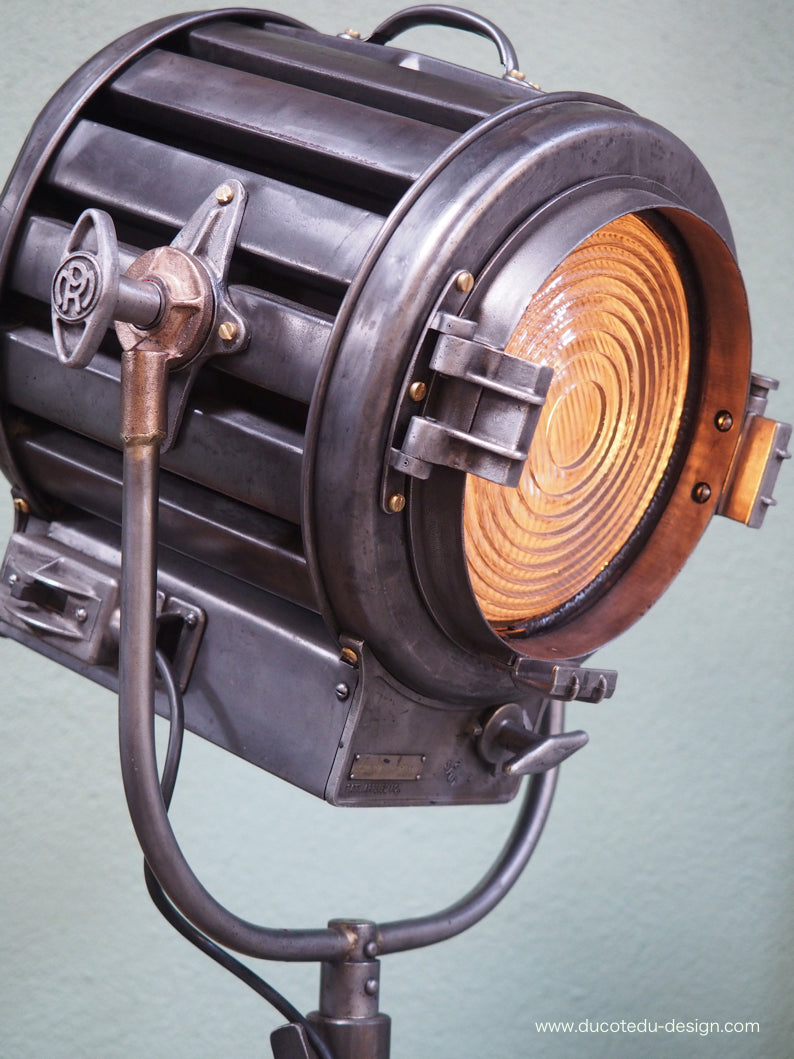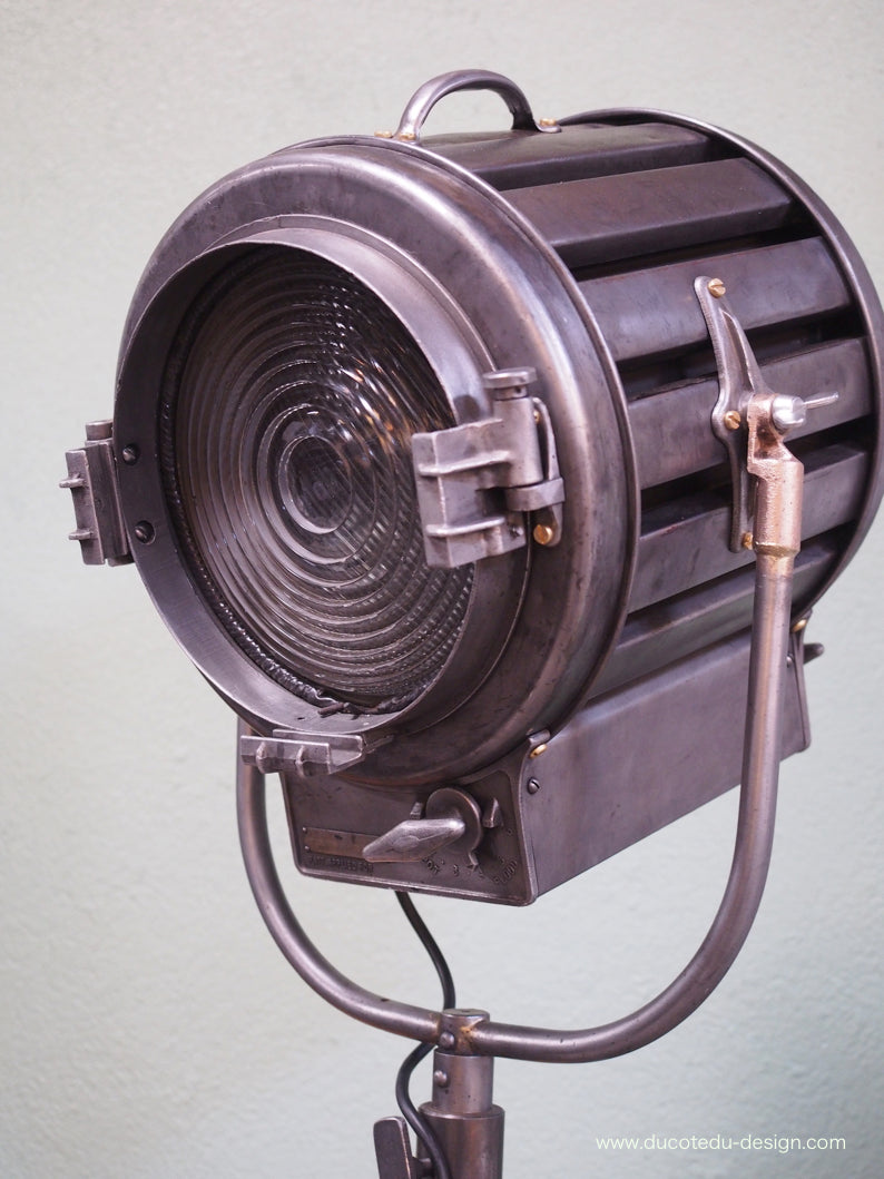 a l'origine il a une puissance de 2000 watts electricite refaite, muni d'une douille D22 standard possibilite de mettre l'ampoule de votre choix fonctionne sur 220 V. très stable grace à son grand pied tripod