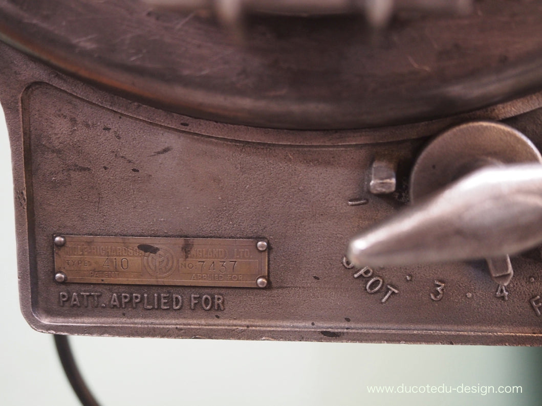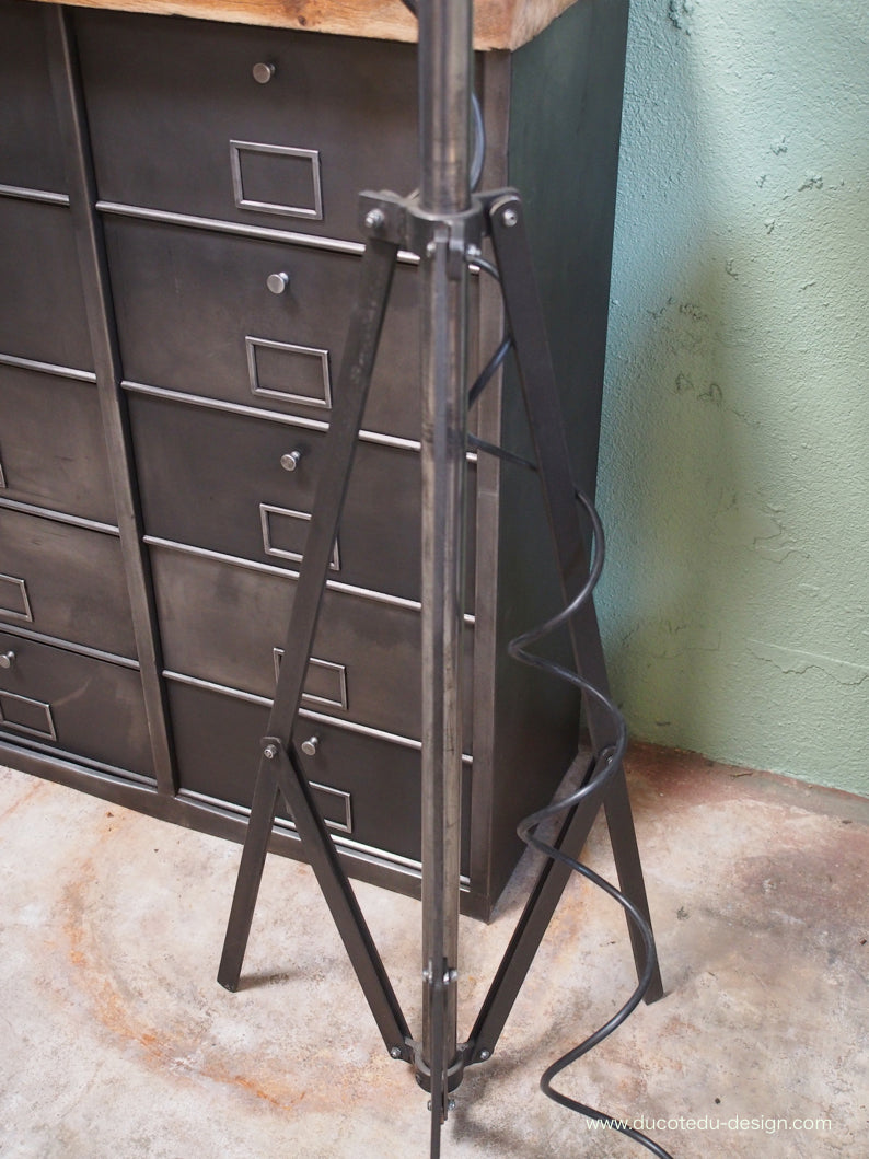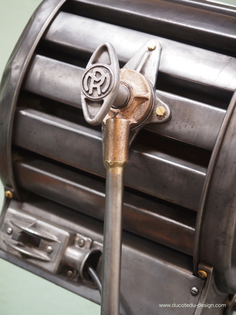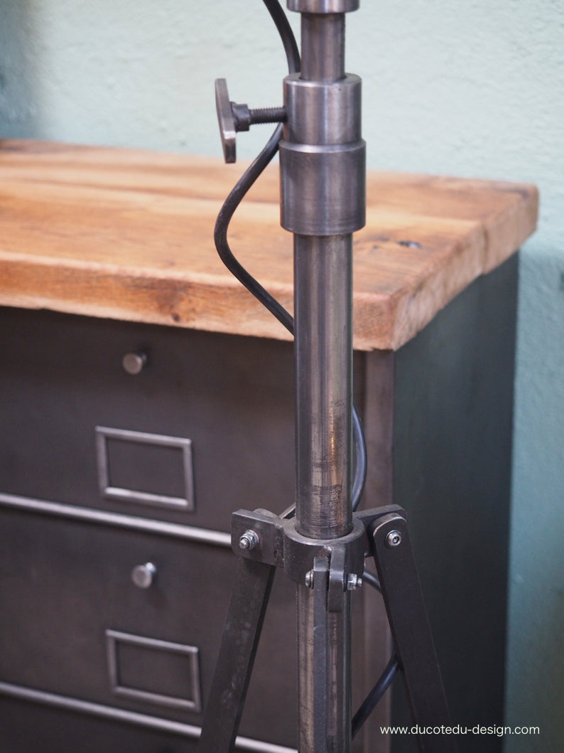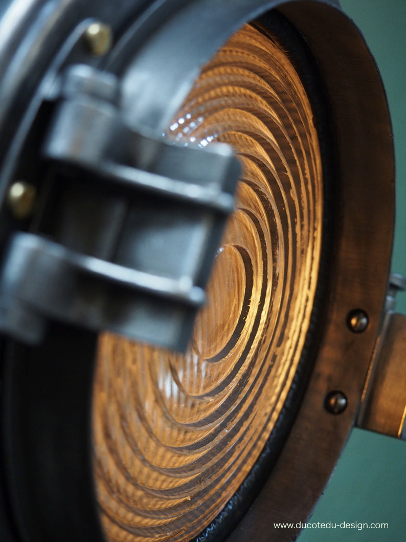 a l'origine il a une puissance de 2000 watts electricite refaite, muni d'une douille D22 standard possibilite de mettre l'ampoule de votre choix fonctionne sur 220 V. très stable grace à son grand pied tripod