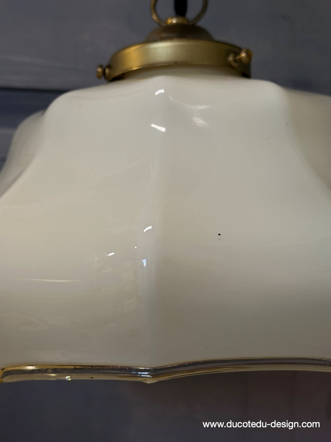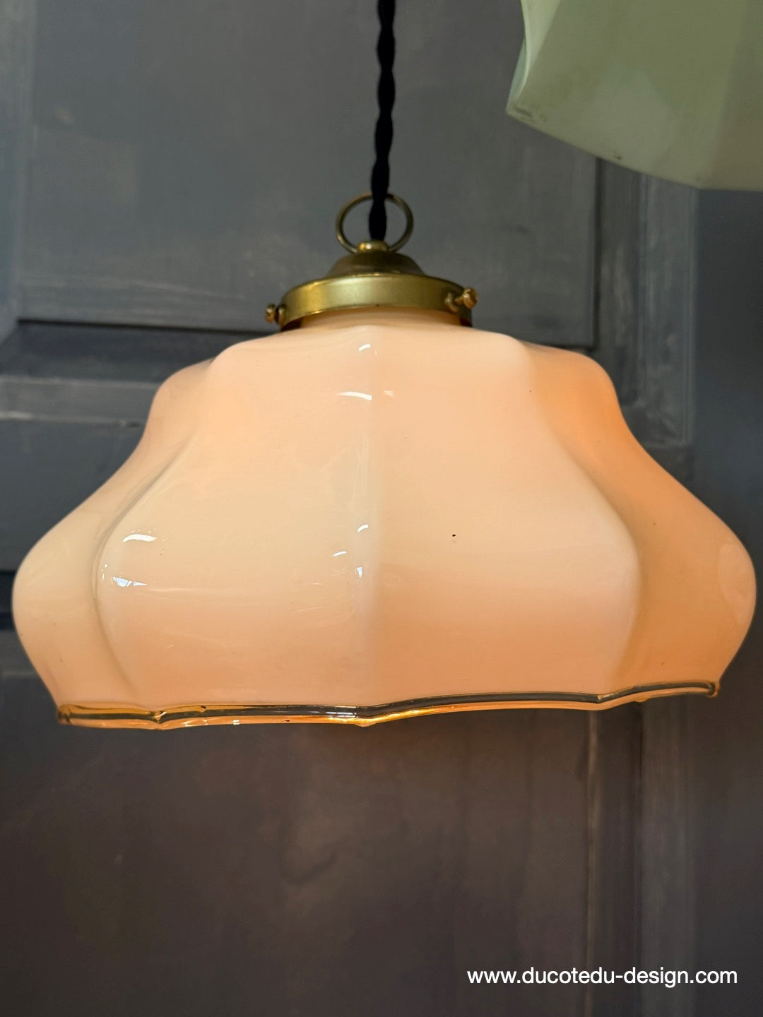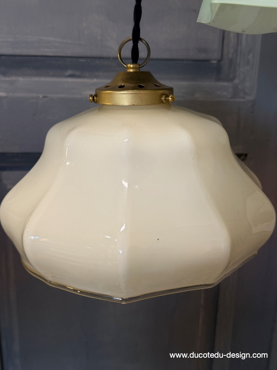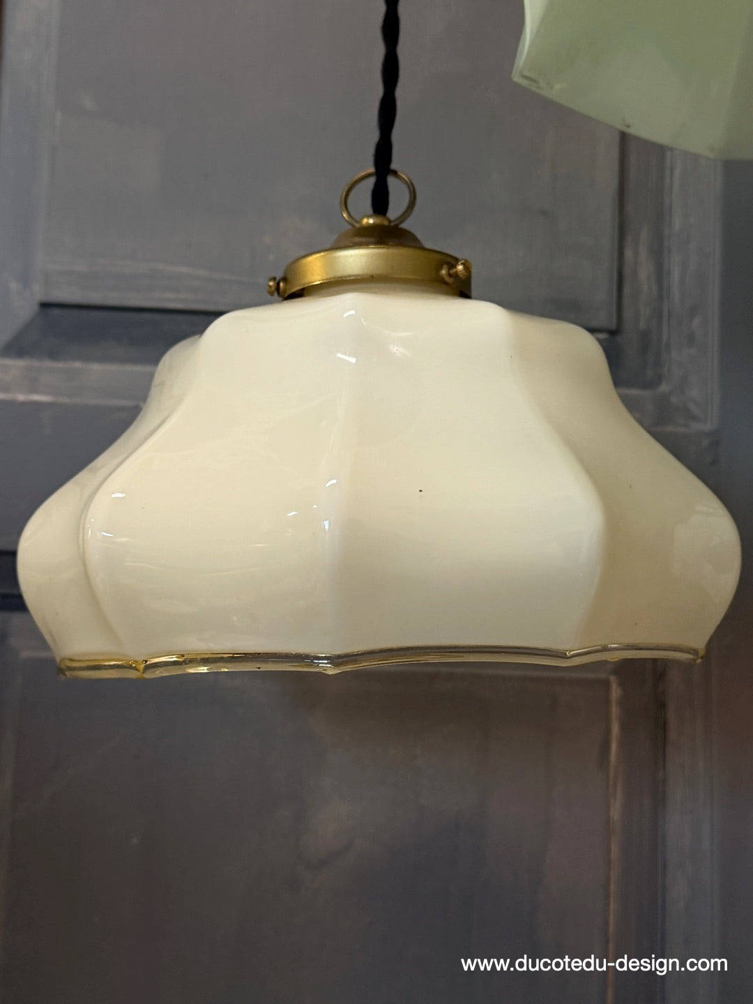 Suspension ancienne en opaline creme, abat-jour festonné vintage, luminaire campagne chic