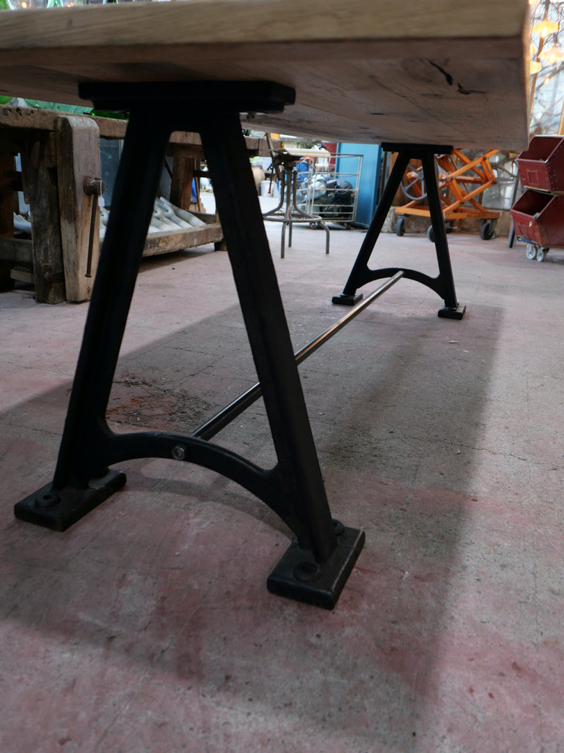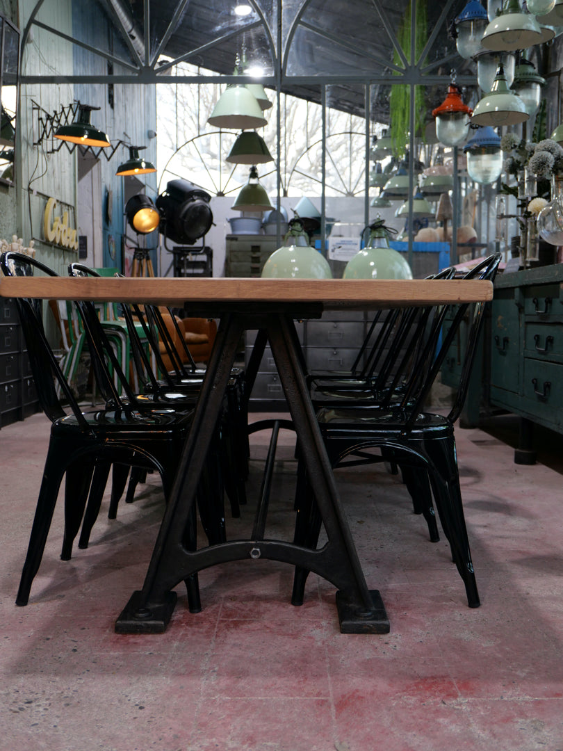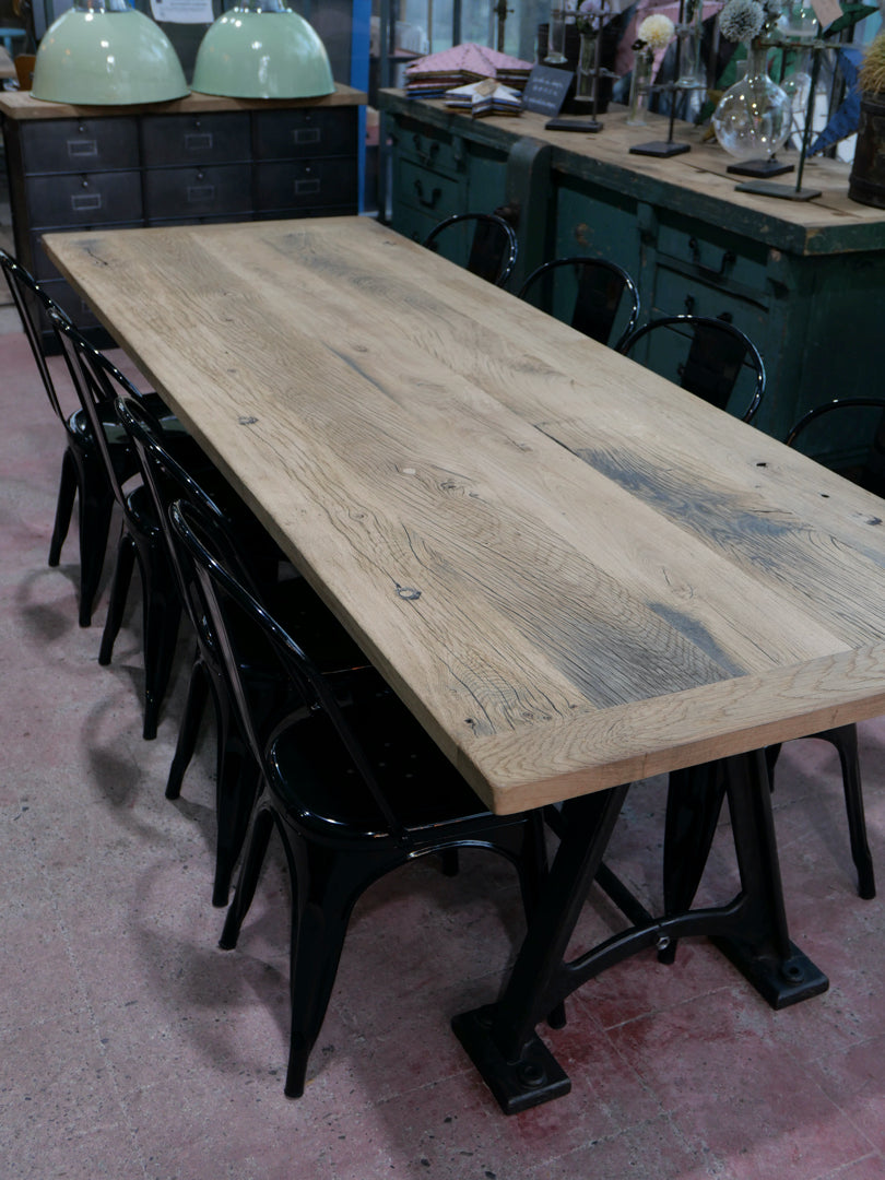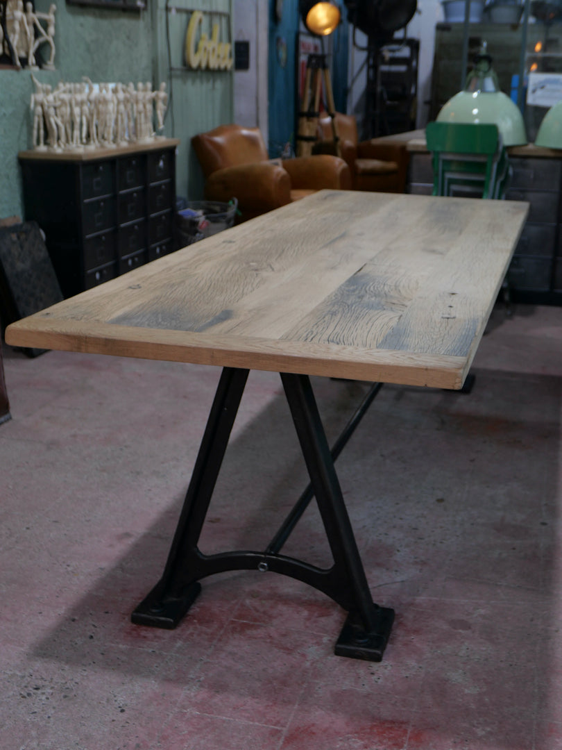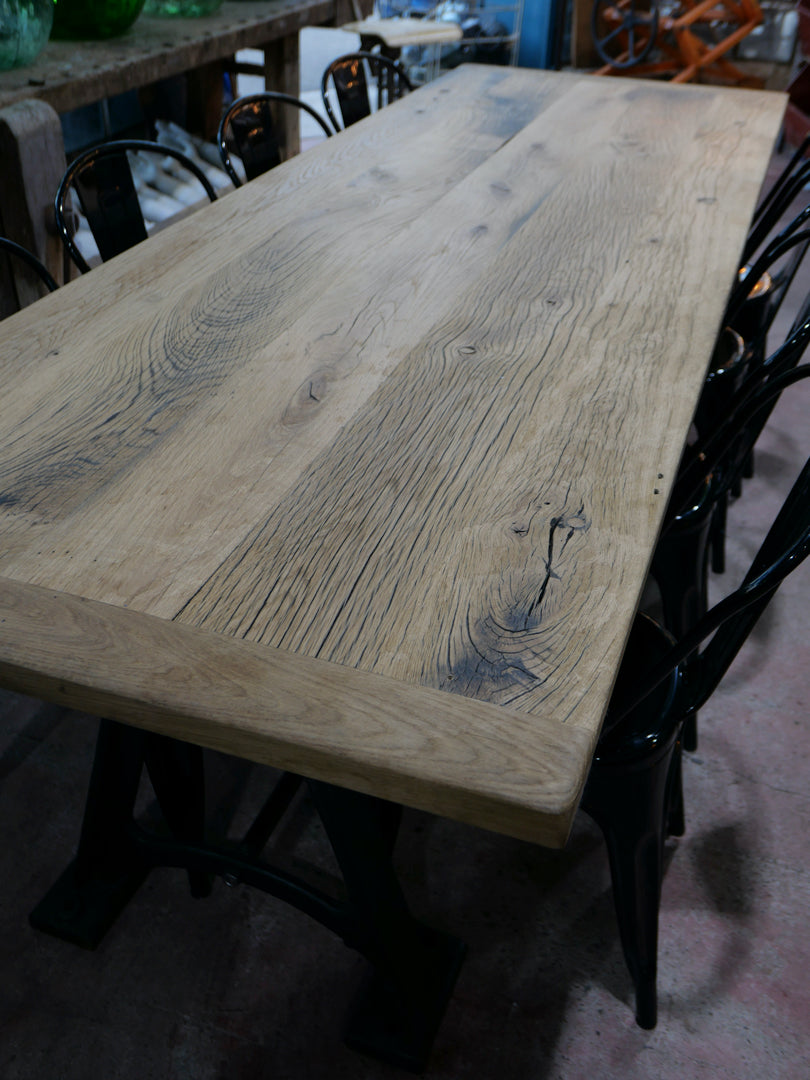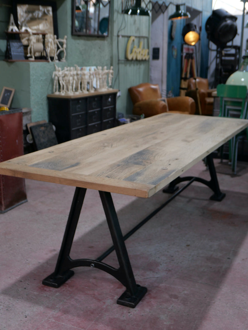 grande table industrielle plateau bois ancien chene massif pietement fonte