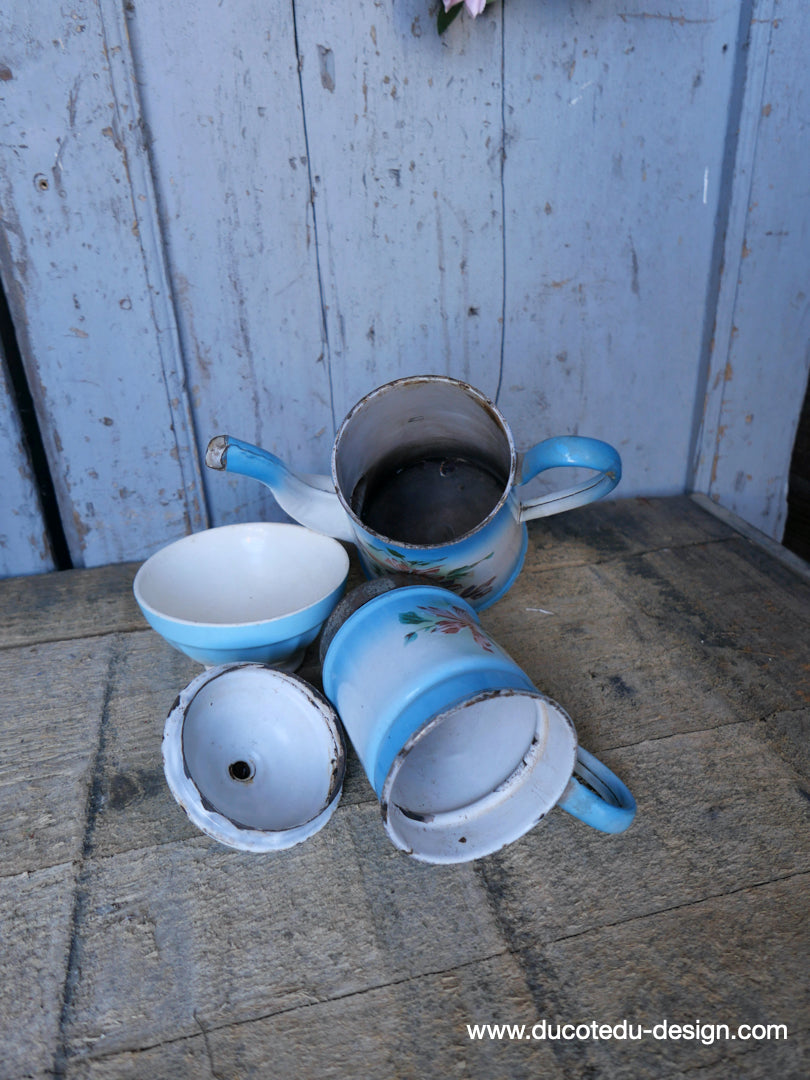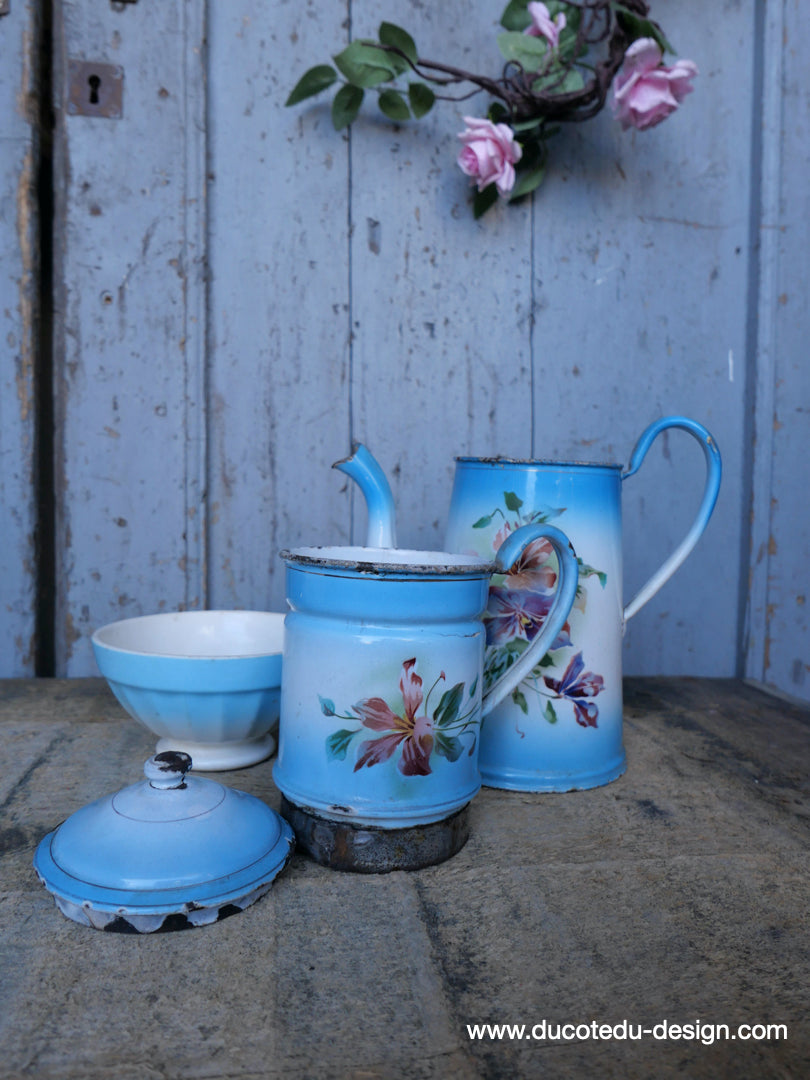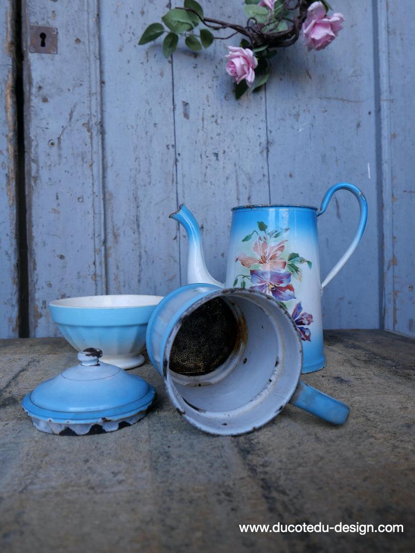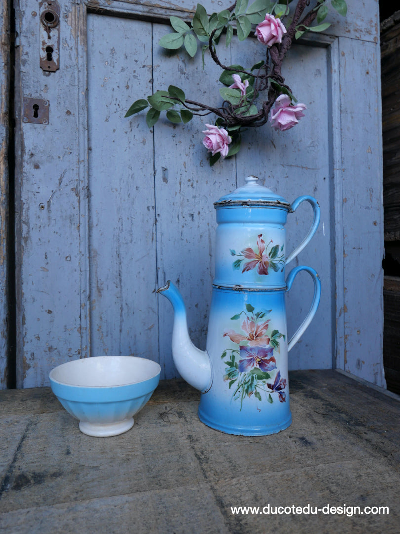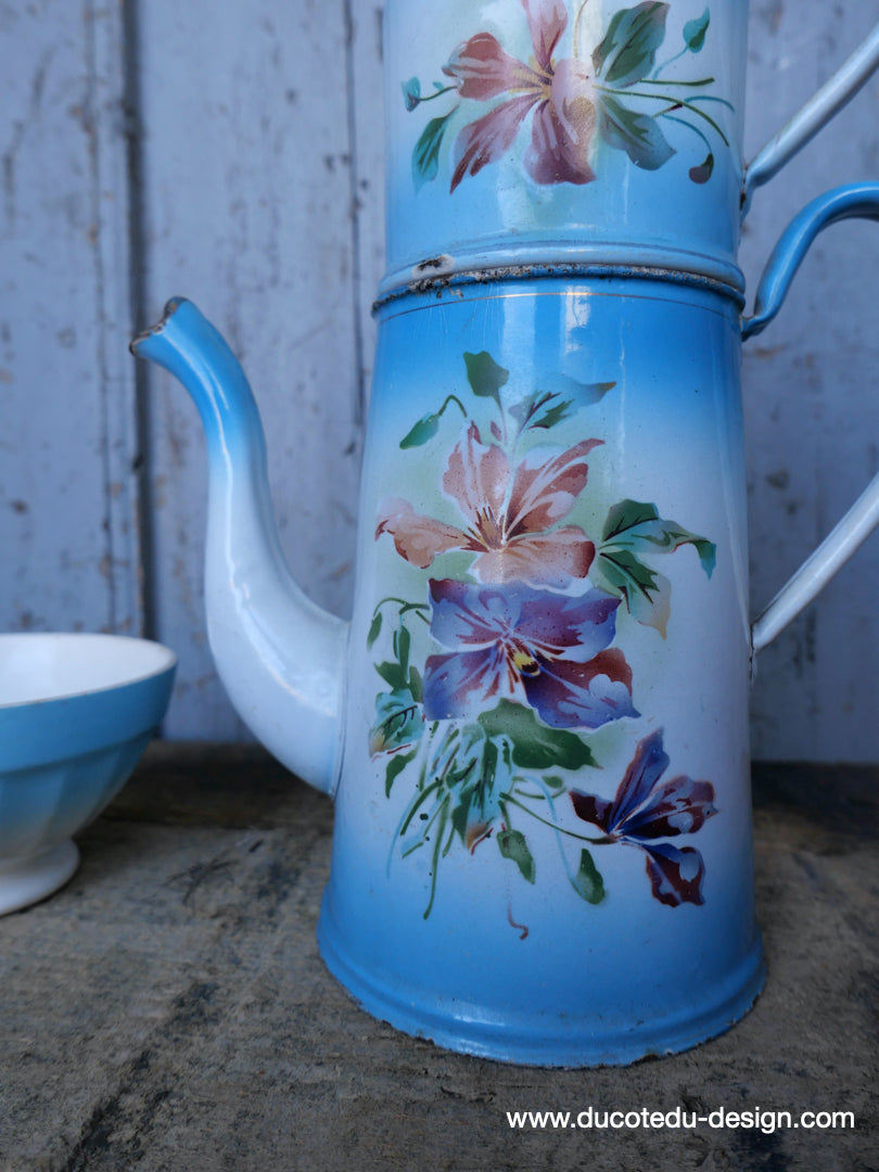 ancienne cafetiere emaillée decor de fleurs