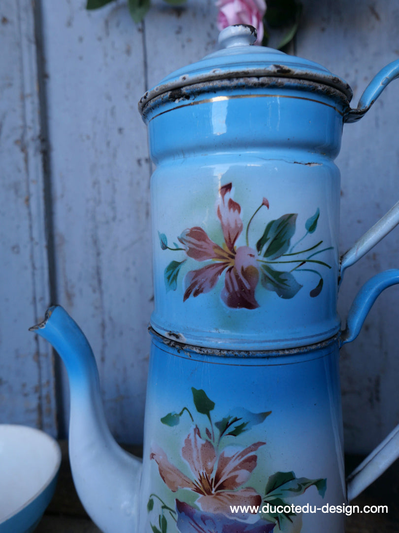 ancienne cafetiere emaillée decor de fleurs