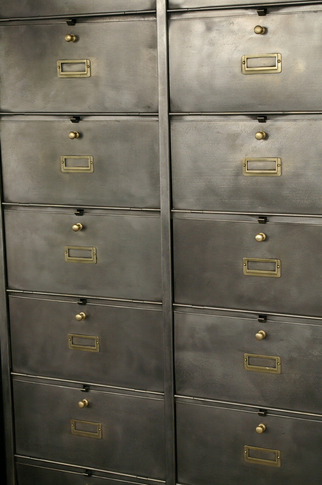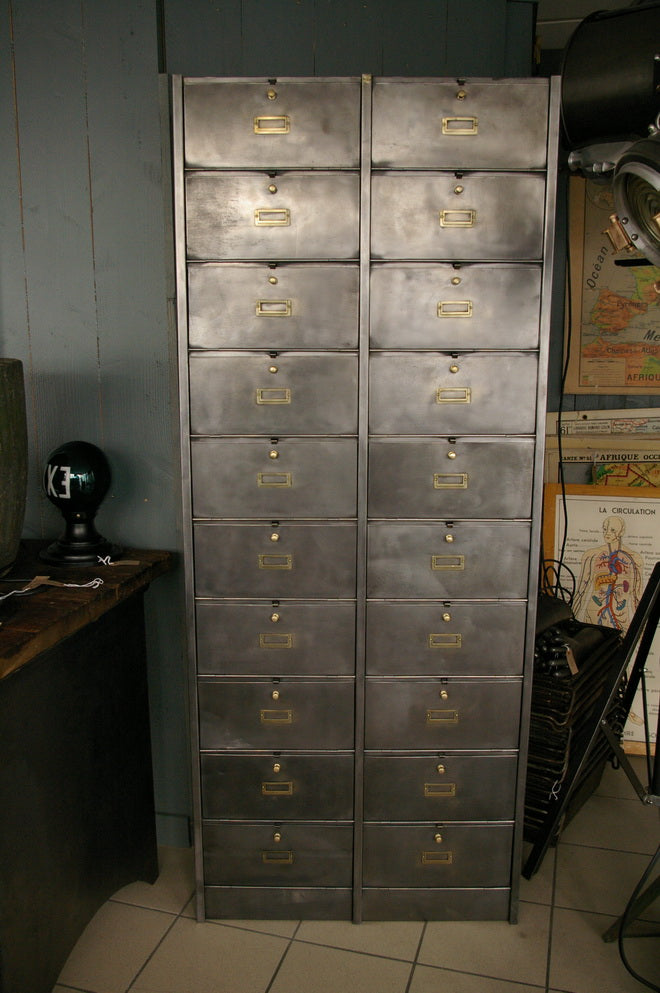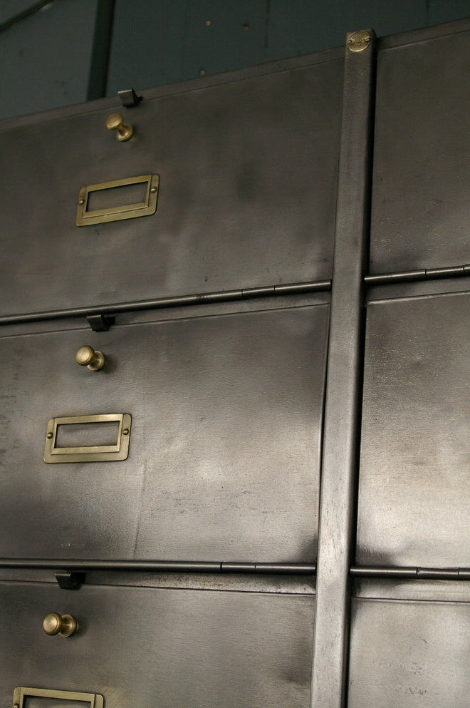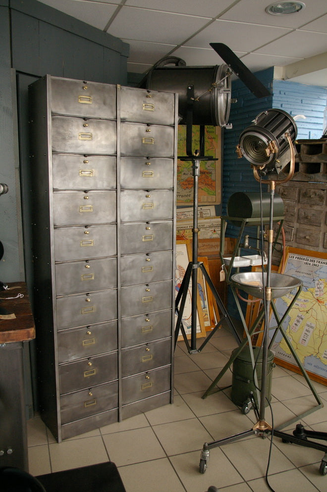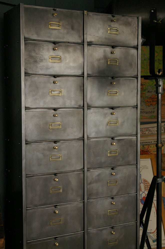 Antique large industrial cabinet with 20 drop-front compartments, Roneo, 1940
