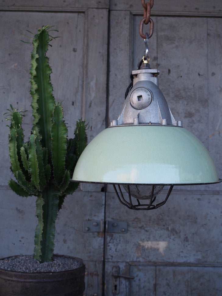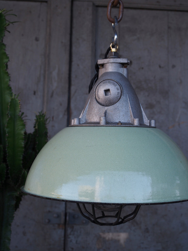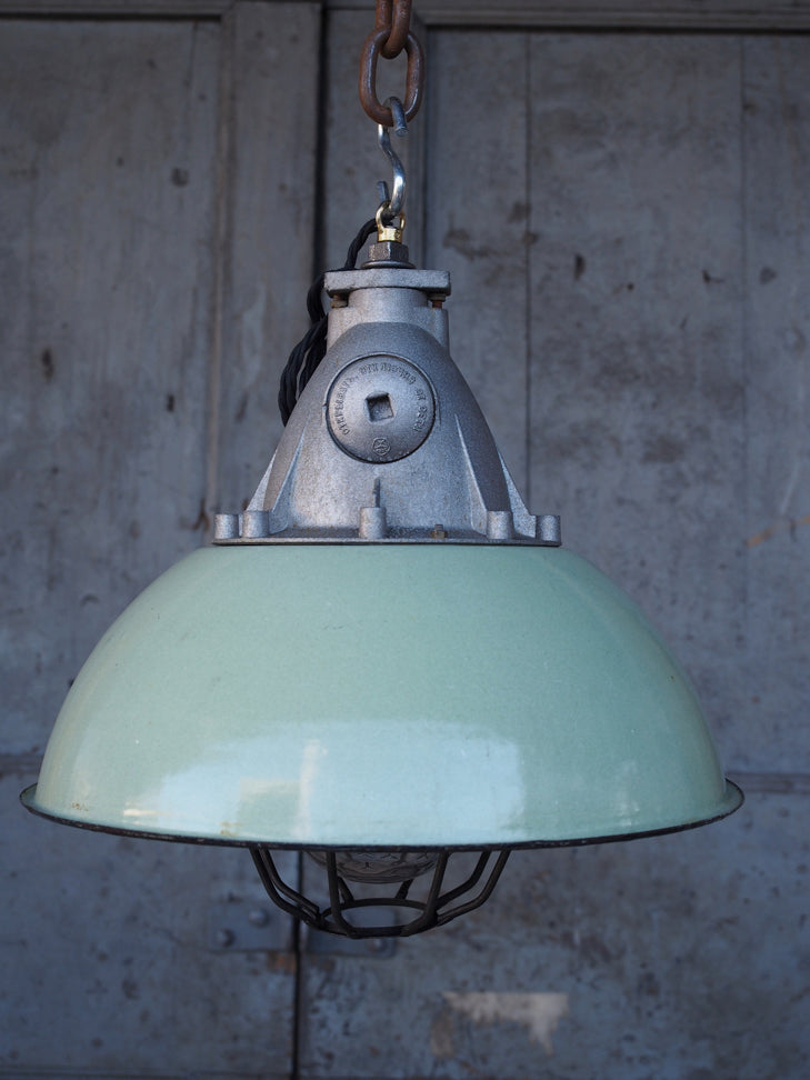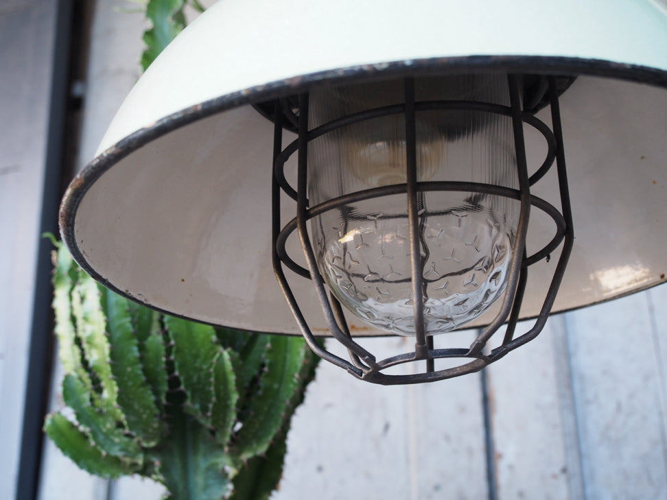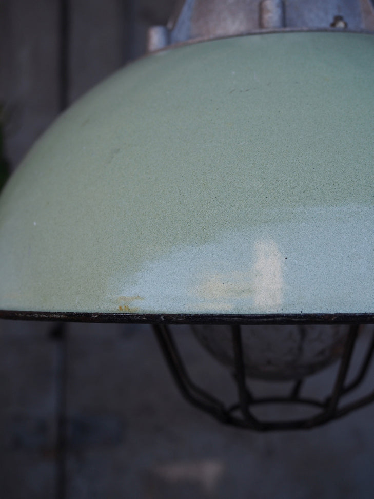 Green enameled lampshade pendant light, industrial grid lamp
