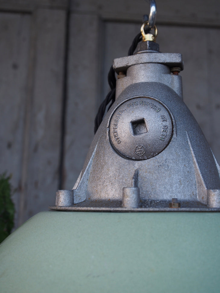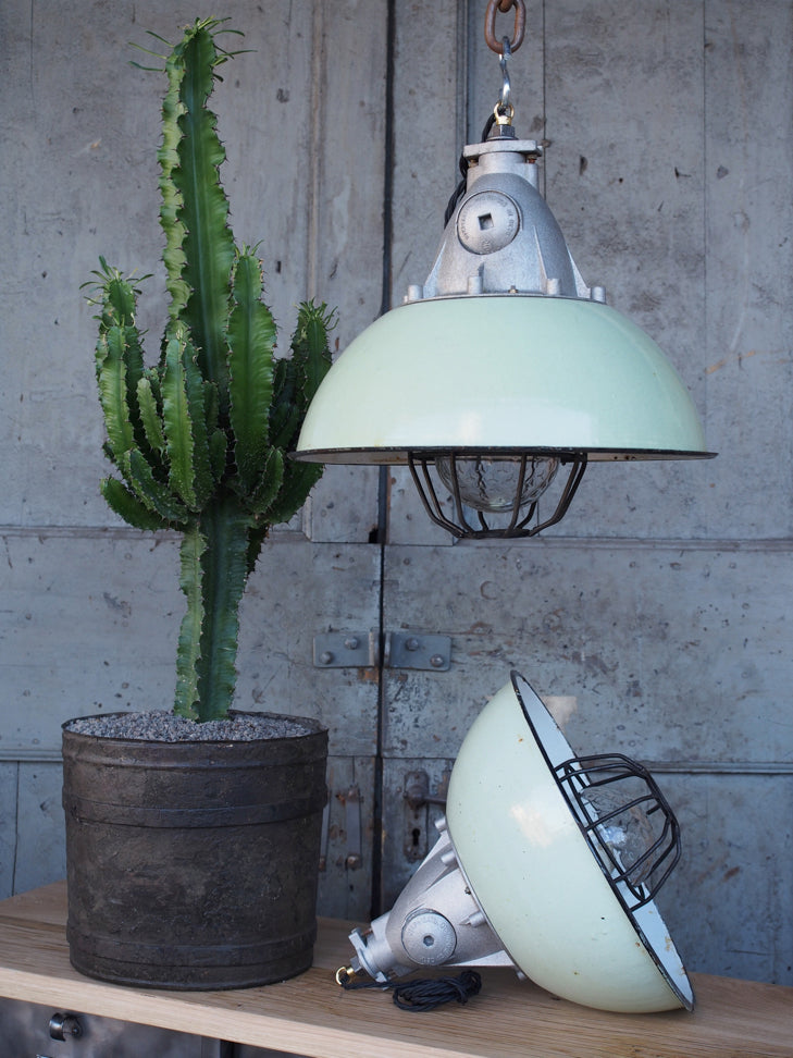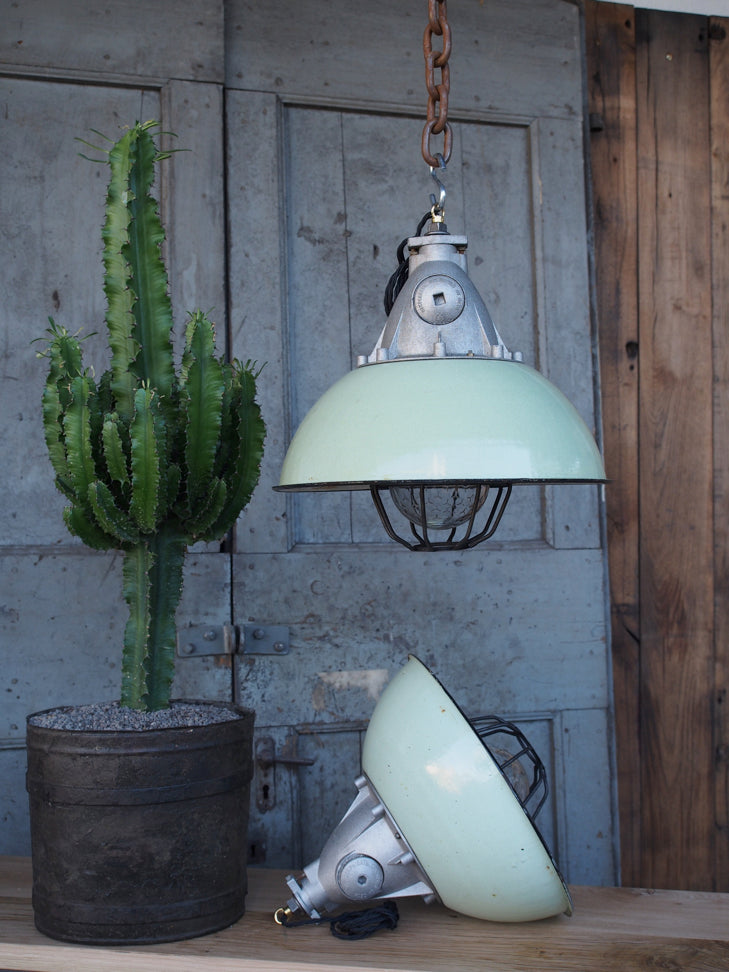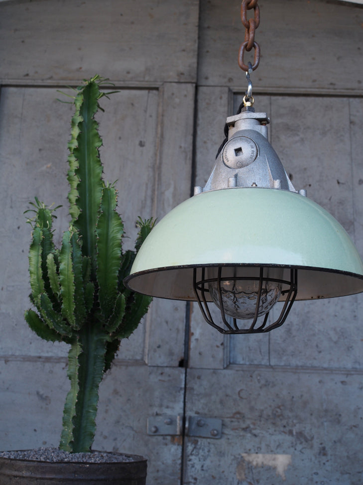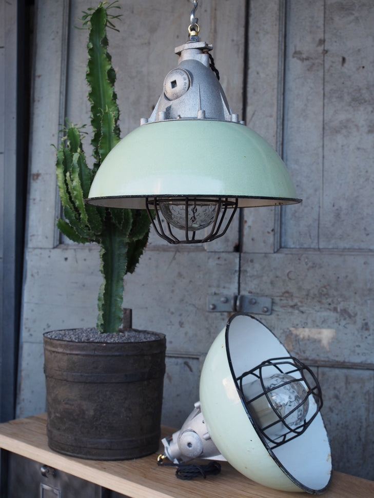 Green enameled lampshade pendant light, industrial grid lamp
