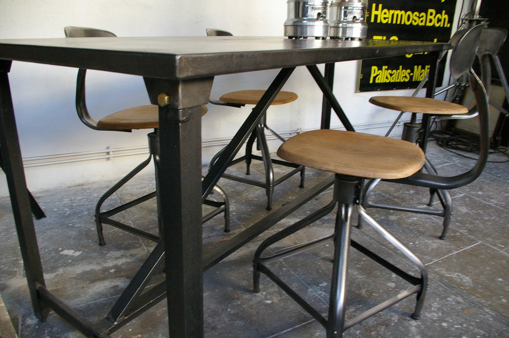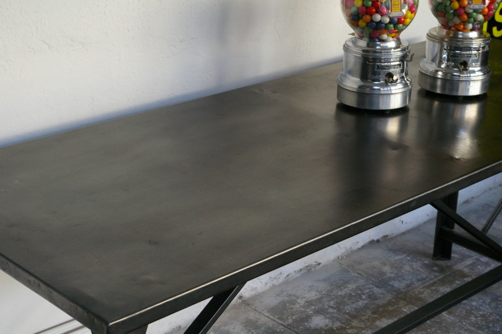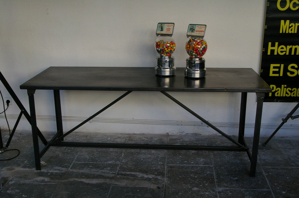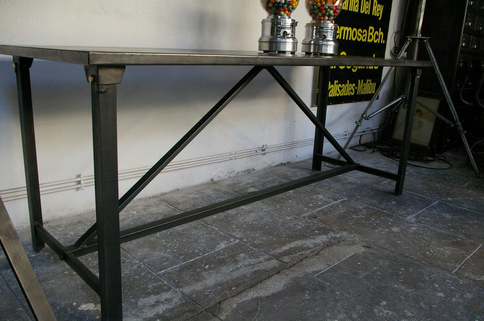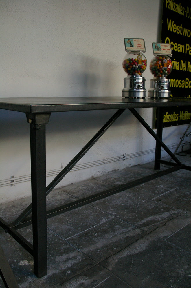 A completely metallic table with very clean lines.