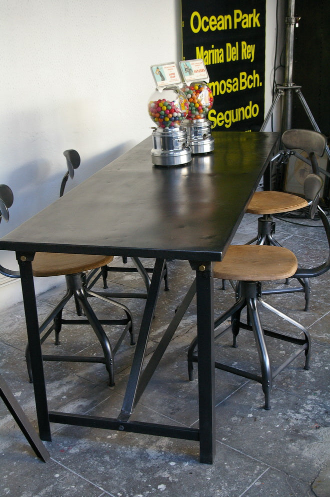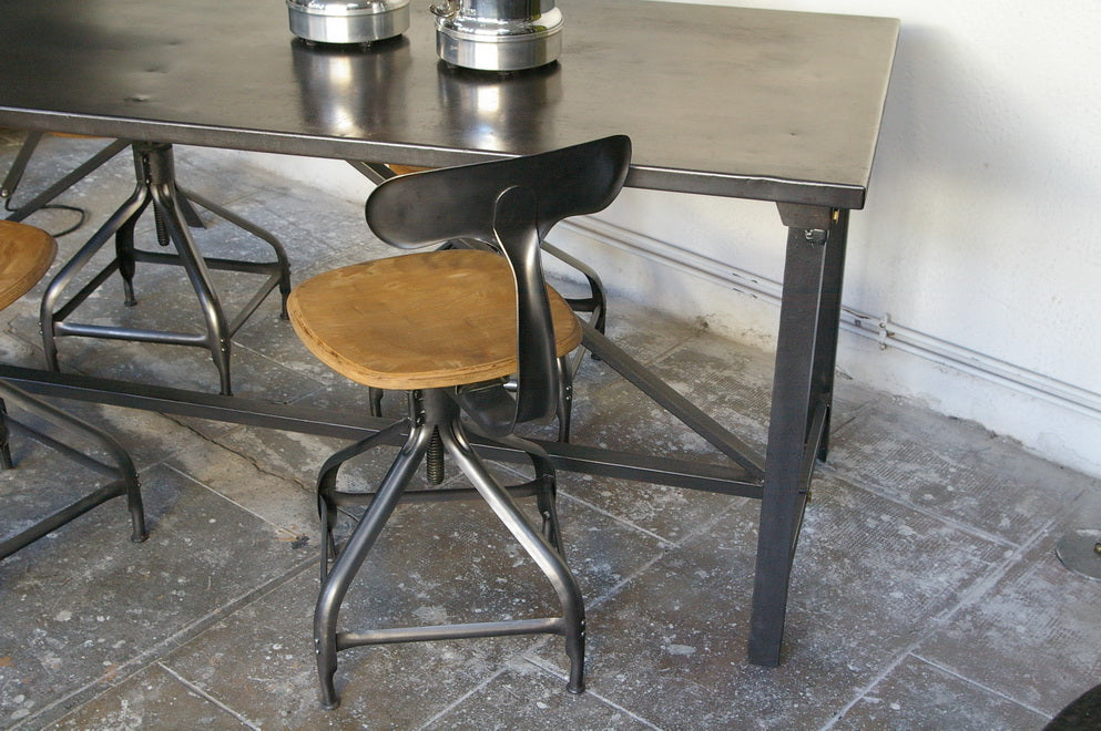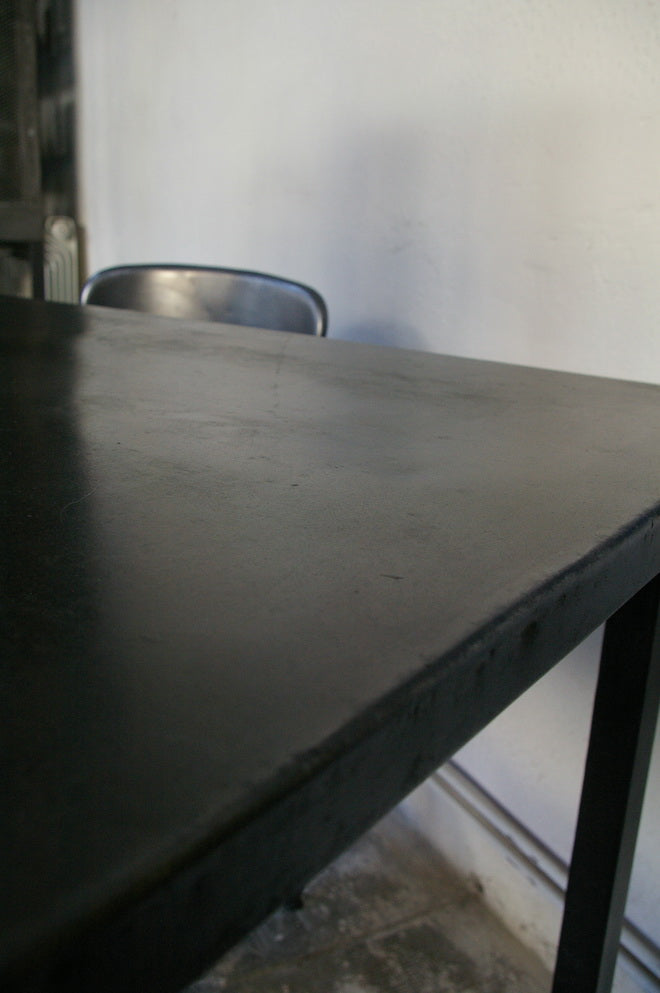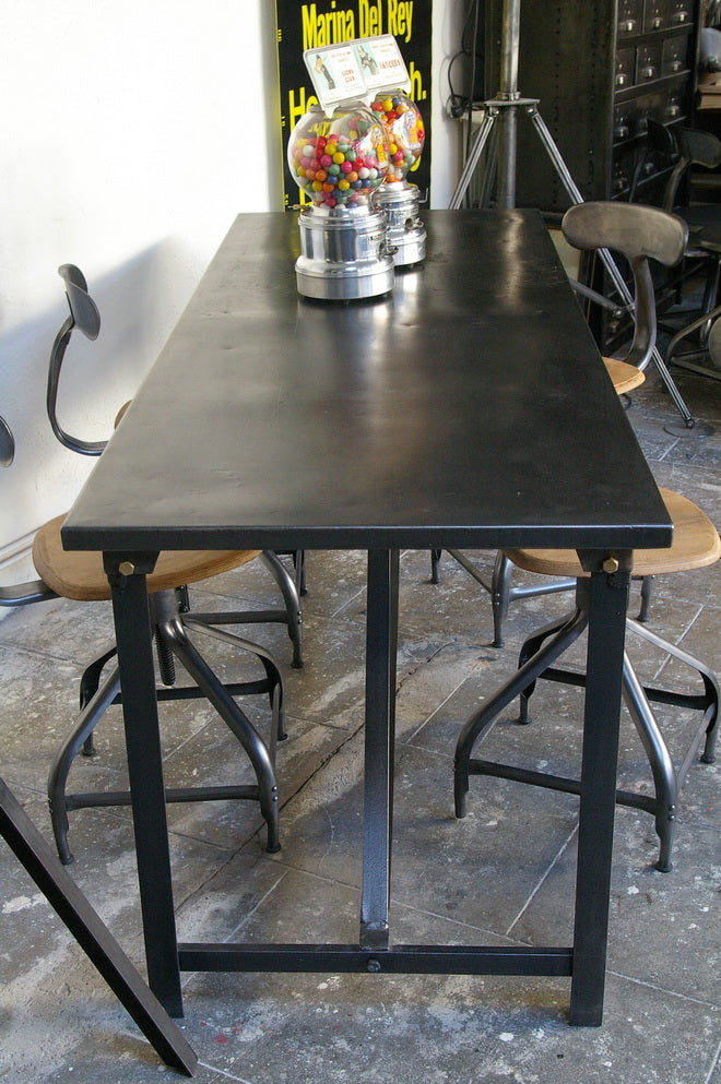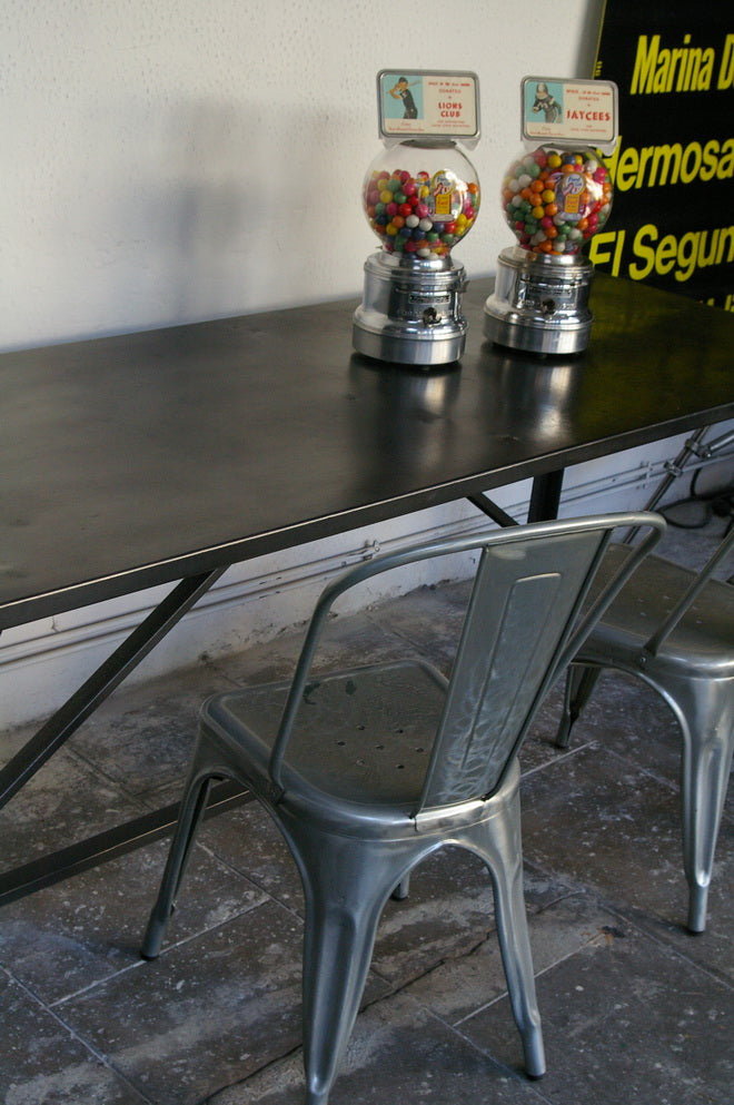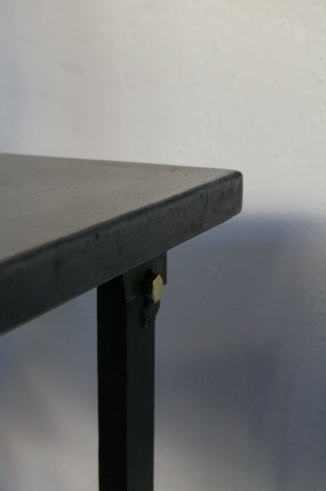 A completely metallic table with very clean lines.