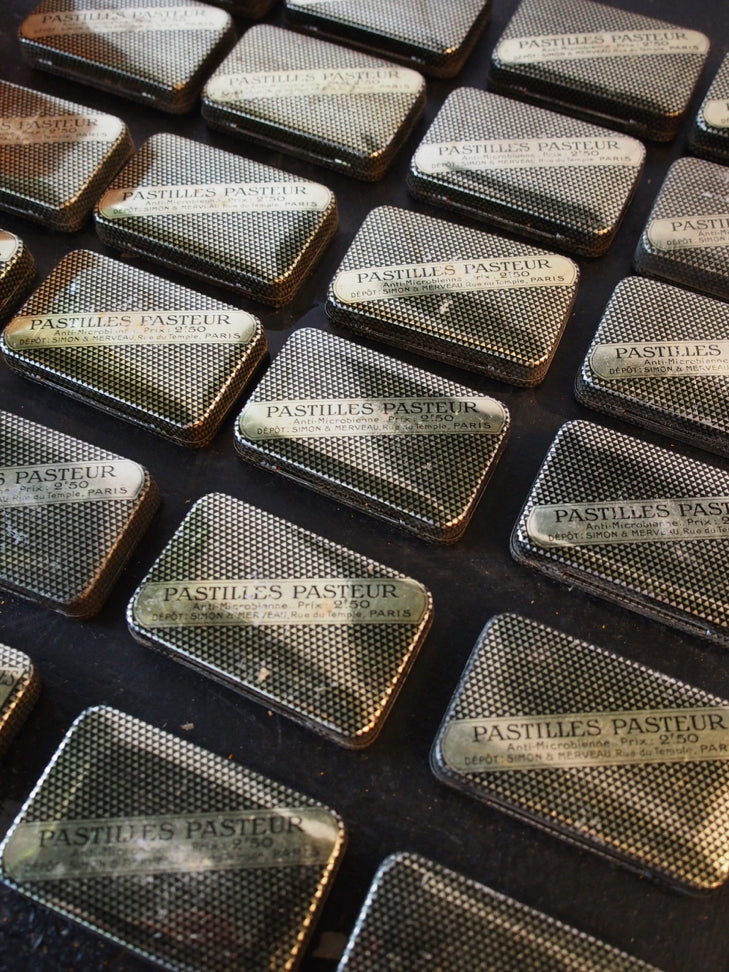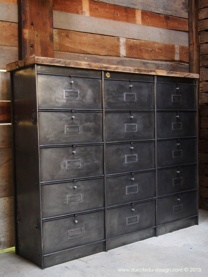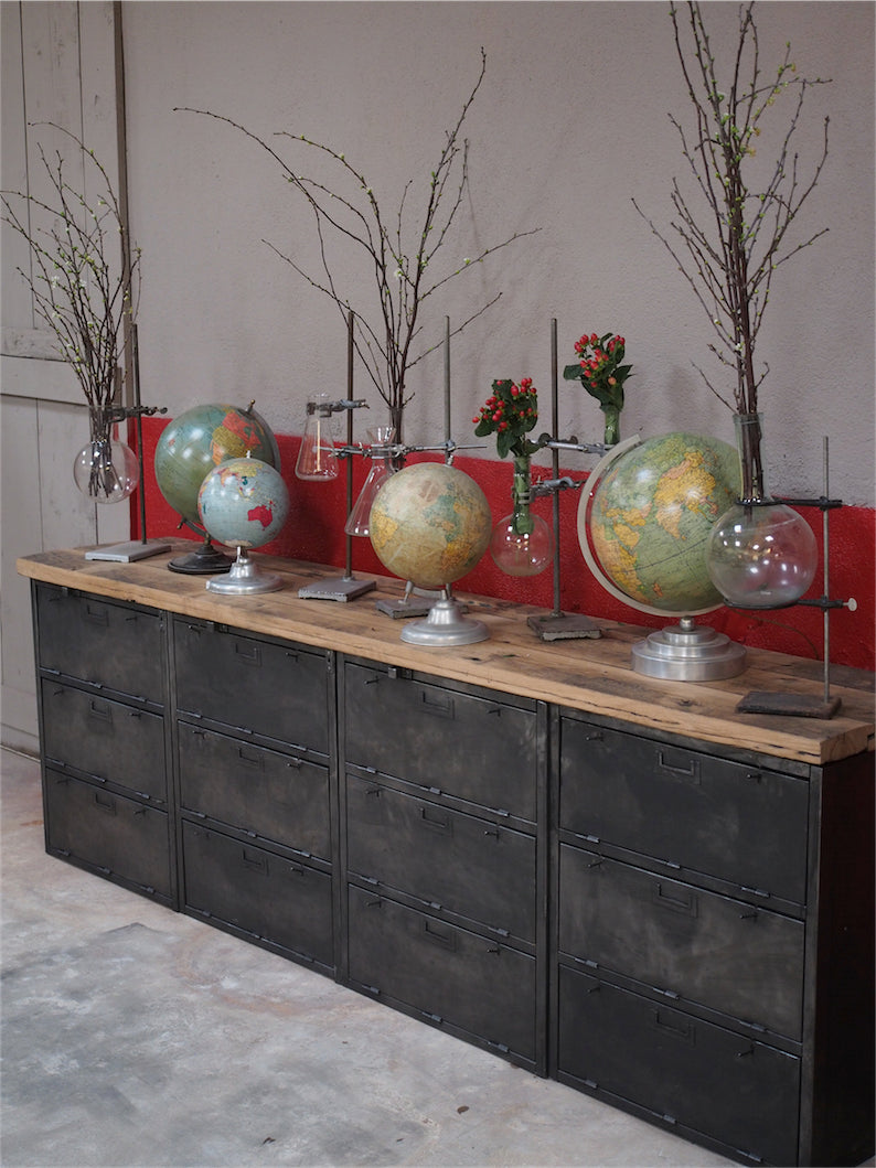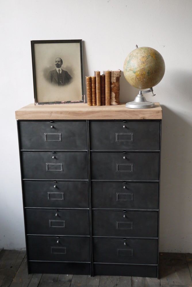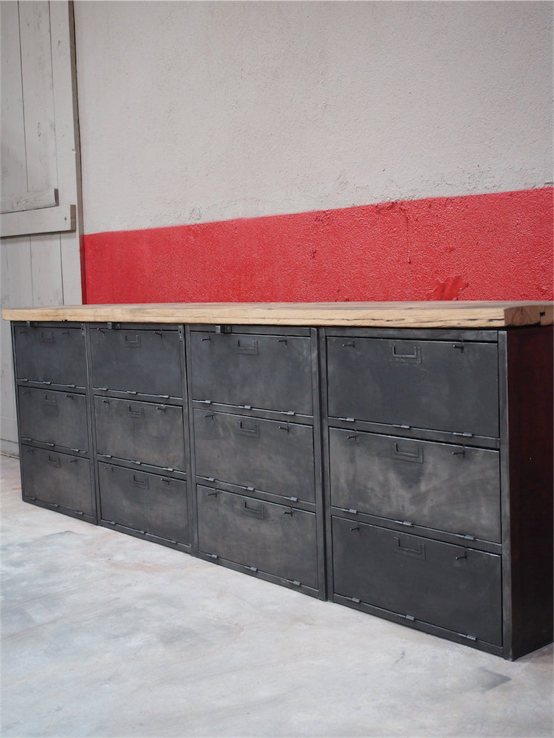 industrial 12-compartment sideboard, military workshop style, solid old oak top