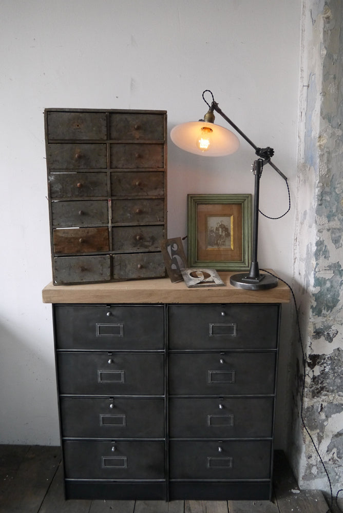 Industrial sideboard with 6 compartments and 18 drawers, military workshop style, solid old oak top