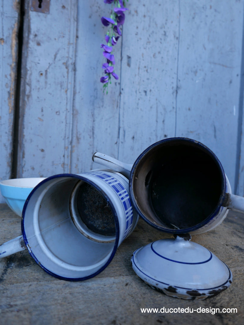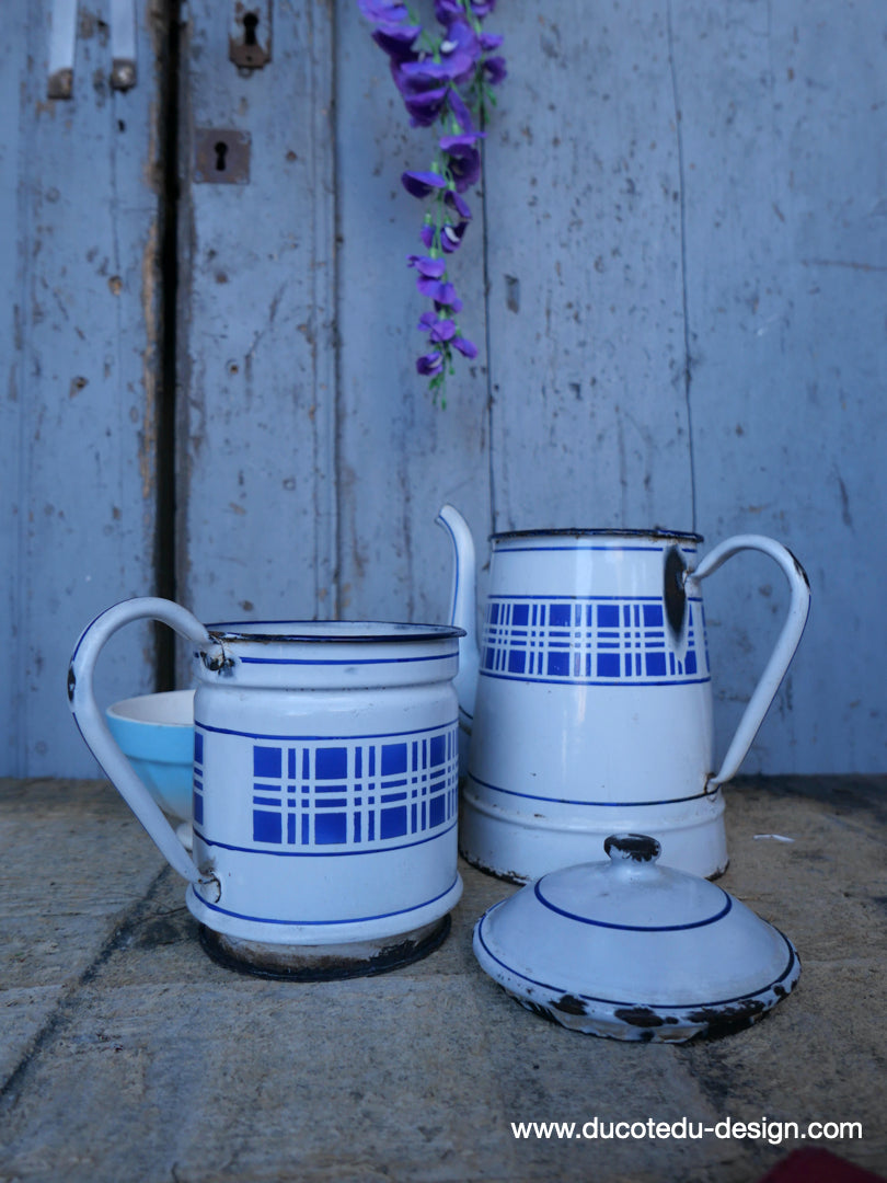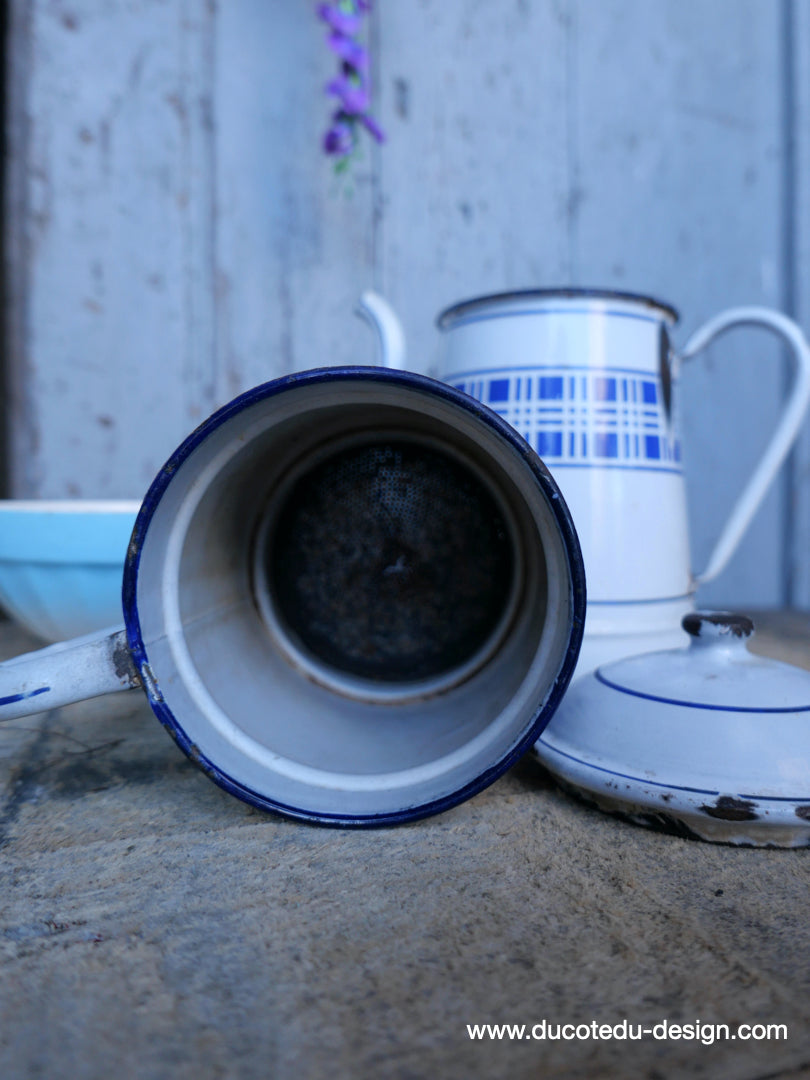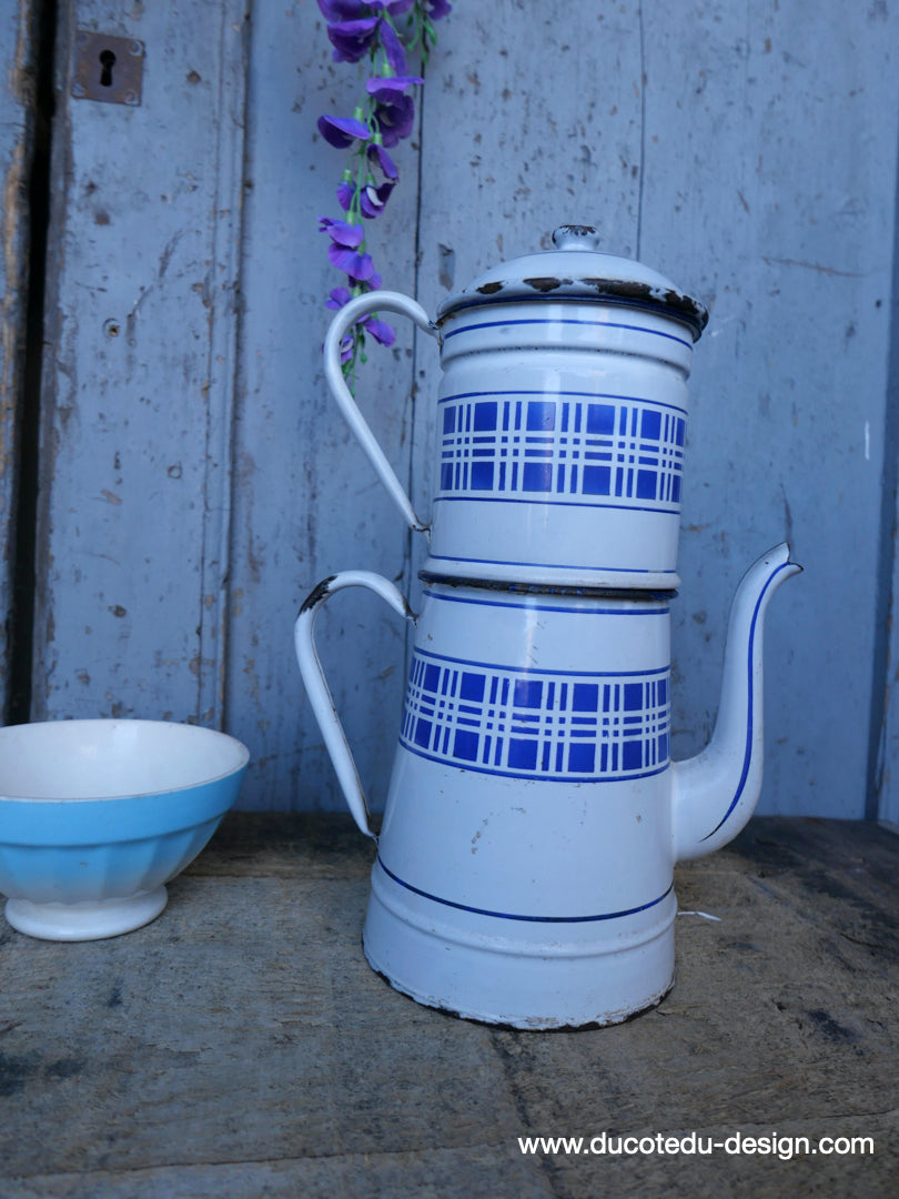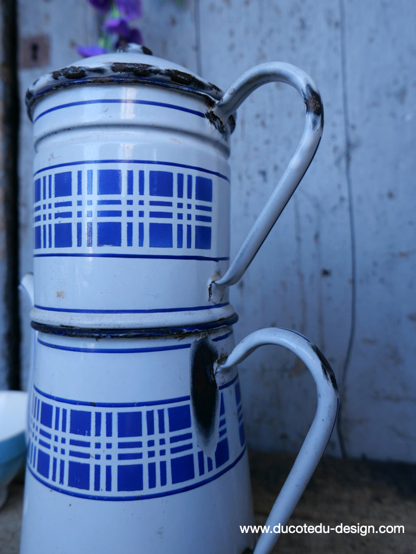 antique enameled coffee pot with blue checkered decoration