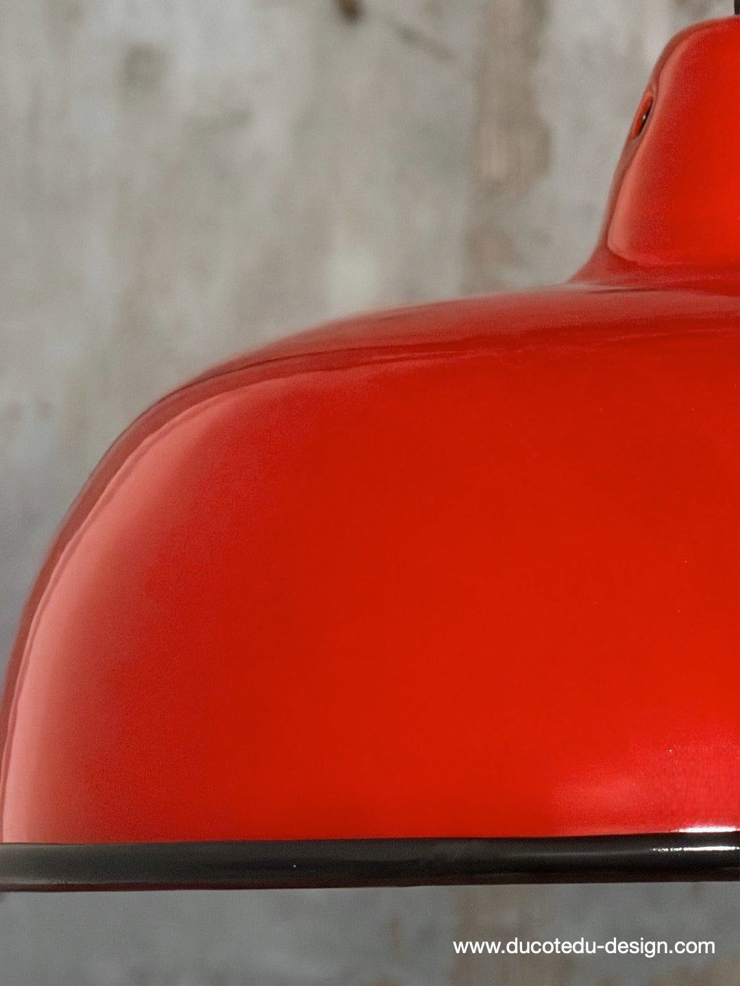 Suspension en tôle émaillée rouge, soulignée d'un délicat liseré noir, au design sobre et fonctionnel inspiré des luminaires d'atelier.