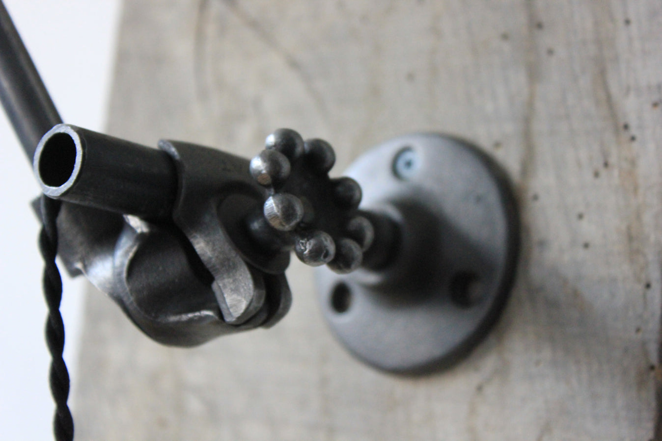 wall-mounted lamp with two articulated arms, 57 and 67 cm long.