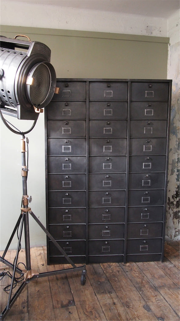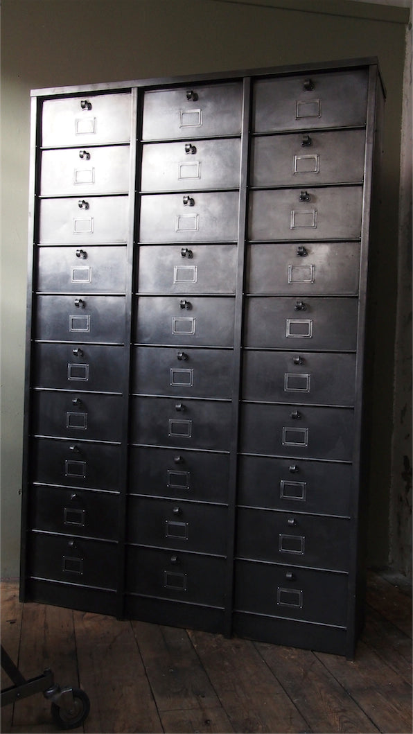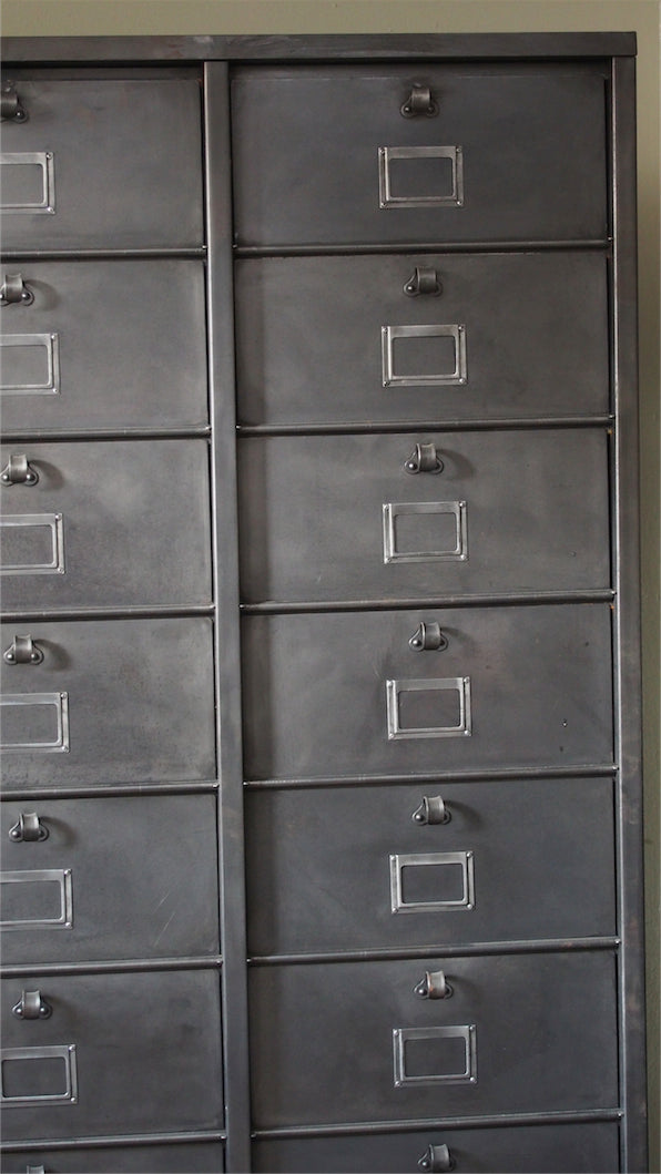 Ancien meuble industriel a clapet strafor 30 casiers, portes etiquette et boutons