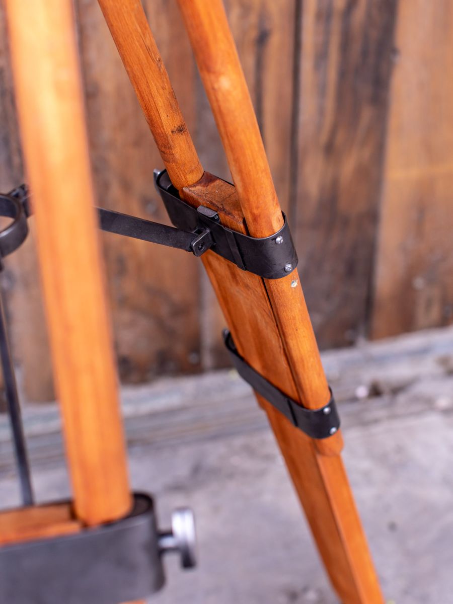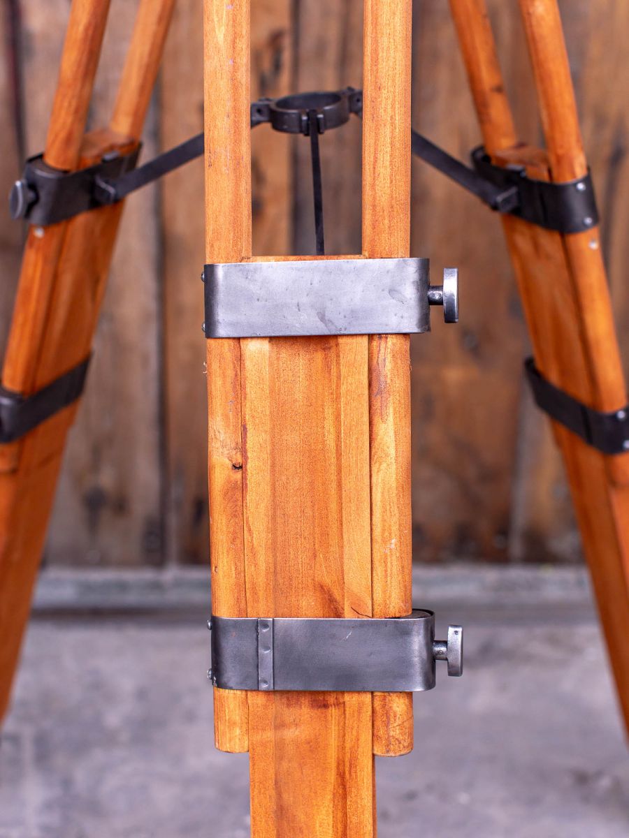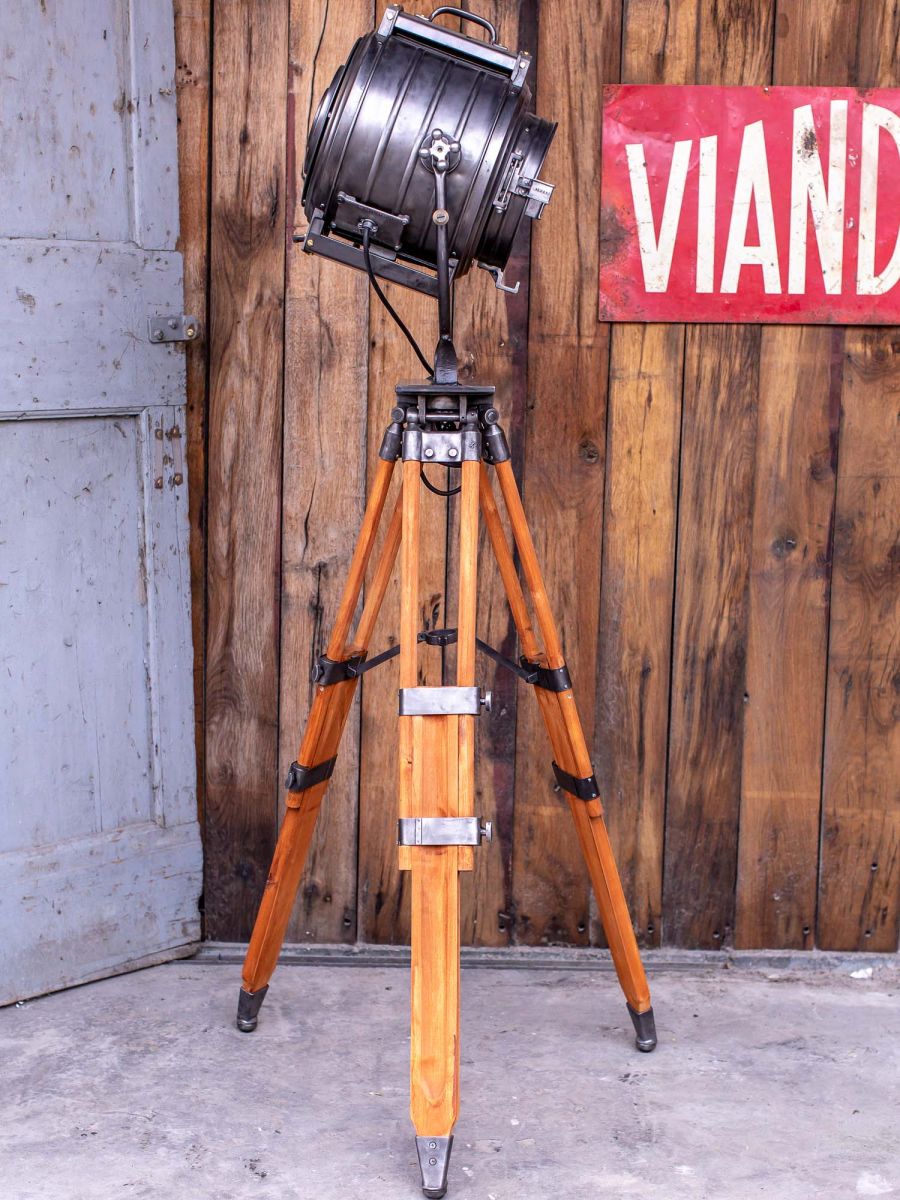 En parfait état de marche ce projecteur provenant d'Hollywood date des années 50/60 muni d'une douille e27 standard équipé d'une lentille de fresnel possibilite de mettre une ampoule au choix fonctionne sur 220 V. très stable grace à son pied tripod bois