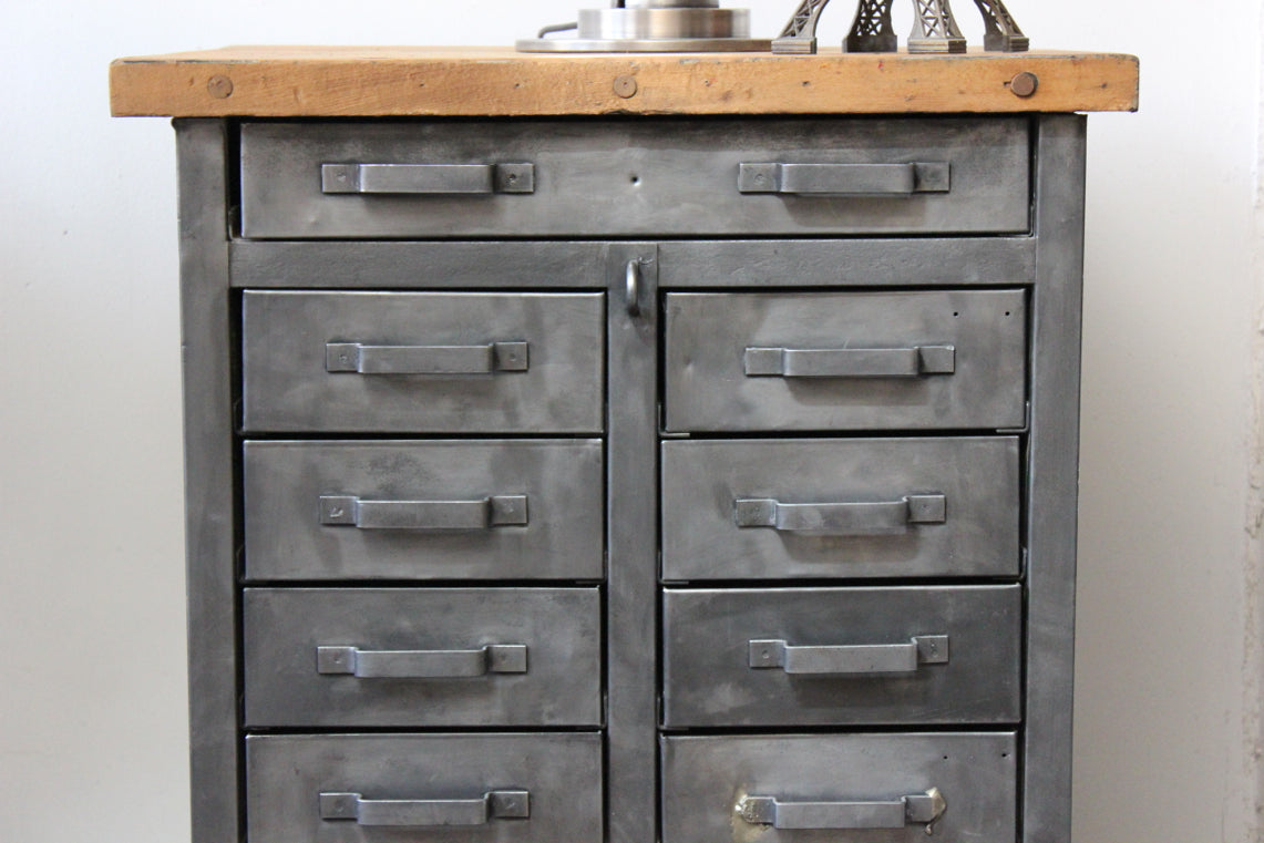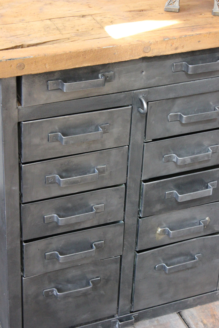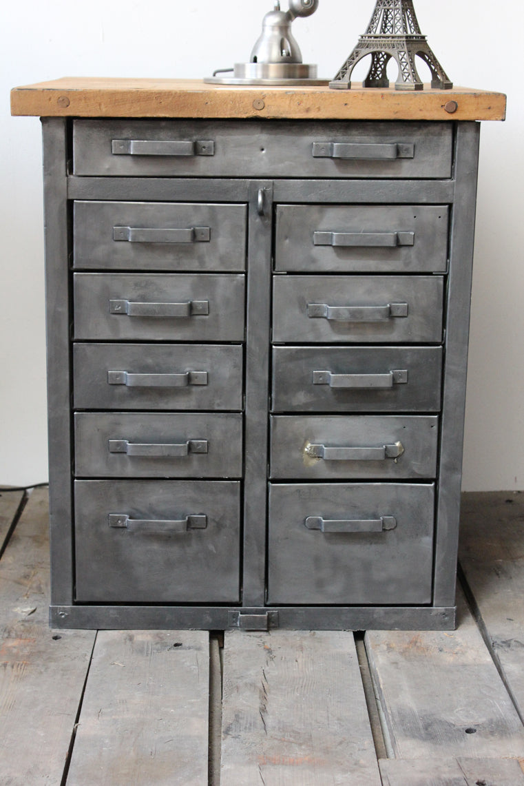 etabli d'atelier industriel metal 11 tiroirs plateau bois massif